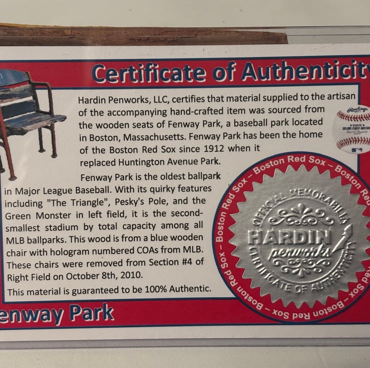 This unique and historic ballpoint pen made from reclaimed certified wood from seats installed at Fenway Park, the oldest Major League Baseball Park still actively in use. Hand turned by me in my own workshop. The wood was obtained from seats installed in 1934 and removed in 2010, the wood from this seat has seen its share of historic events at this ball park. Perfect for Christmas, birthdays or collectors and comes with an impressive embossed and hologram sealed certificate of authenticity as shown in the product images.