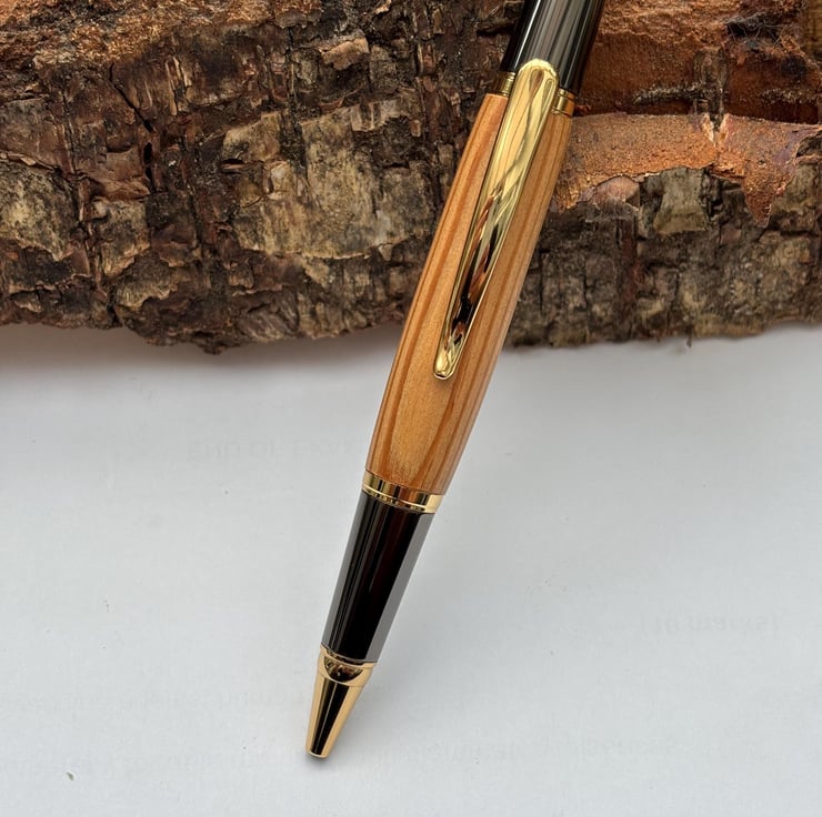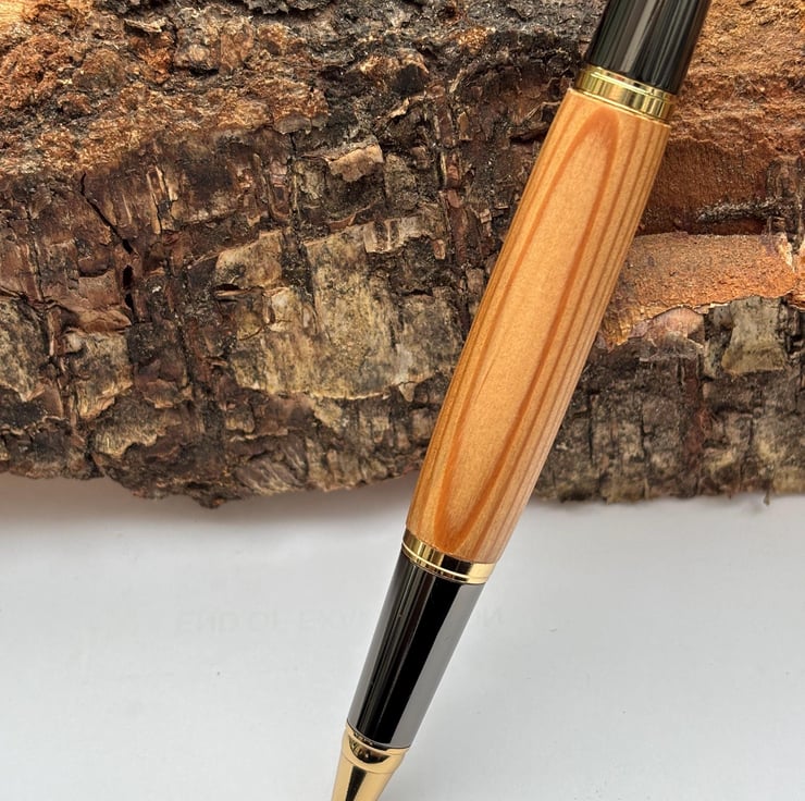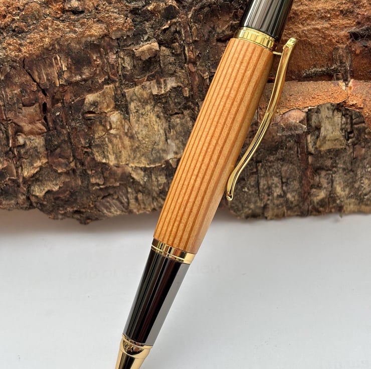 The wood is obtained from a reputable dealer in the USA and a certificate of authenticity, provided by the supplier, will be included with the pen. The metal pen parts are obtained from a UK provider, Beaufort Ink, renowned worldwide for supplying premium pen parts for woodturners. The ballpoint pen is a twist action finial mechanism and can be supplied with black or blue ink. The fittings are in premium quality Gold and Gunmetal. This is an expensive and exclusive pen due to its historic value hence I wanted to use the highest quality pen parts in its construction.