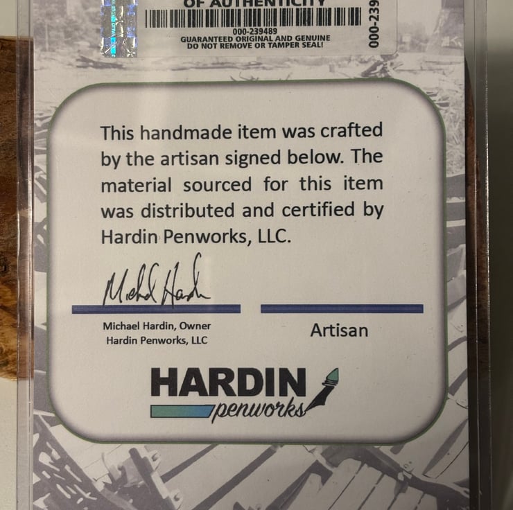 The wooden blank I used to make this pen is shown in the pictures, and is now over 100 years old. The wood supplier in the USA is highly reputable and one of the leading suppliers of genuine historic wood for pen making.