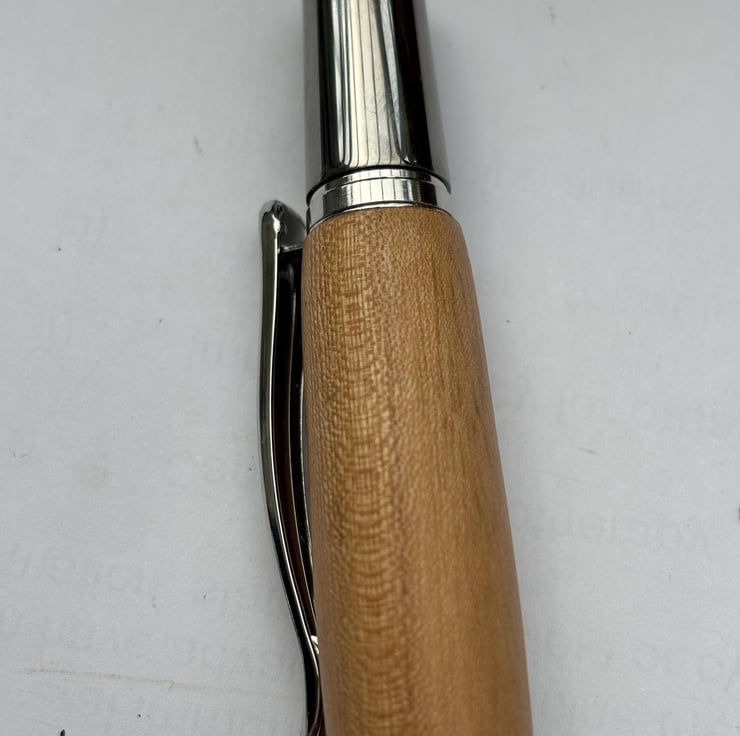 The metal pen parts are obtained from a UK provider, Beaufort Ink, renowned worldwide for supplying premium pen parts for woodturners. The ballpoint pen is a twist action finial mechanism and can be supplied with black or blue ink. The fittings are in premium quality Black Titanium and Rhodium. This is an expensive and exclusive pen due to its historic value hence I wanted to use the highest quality pen parts in its construction.