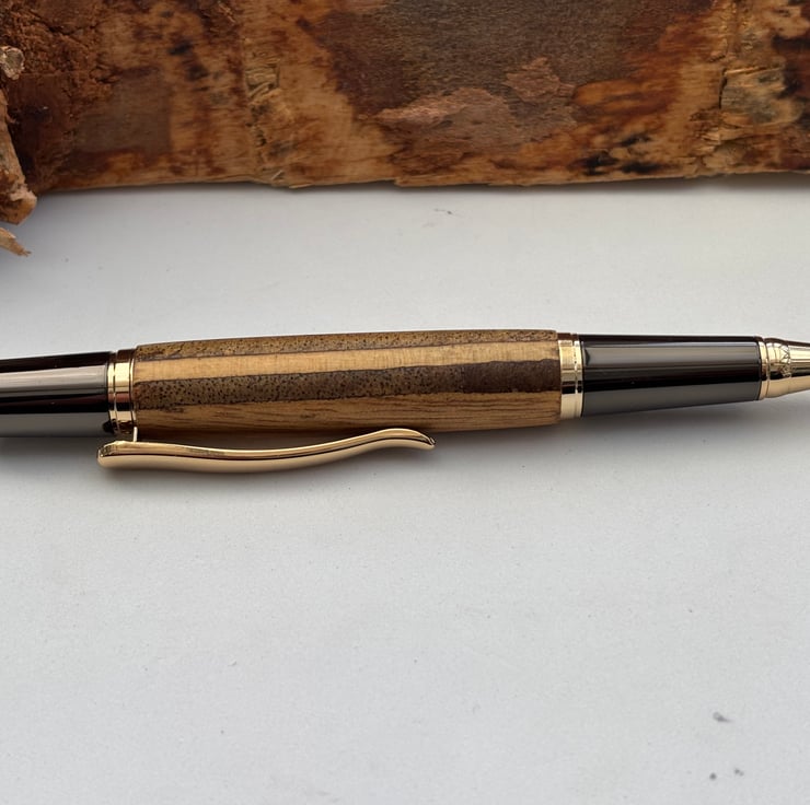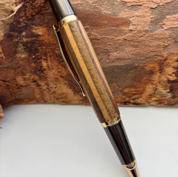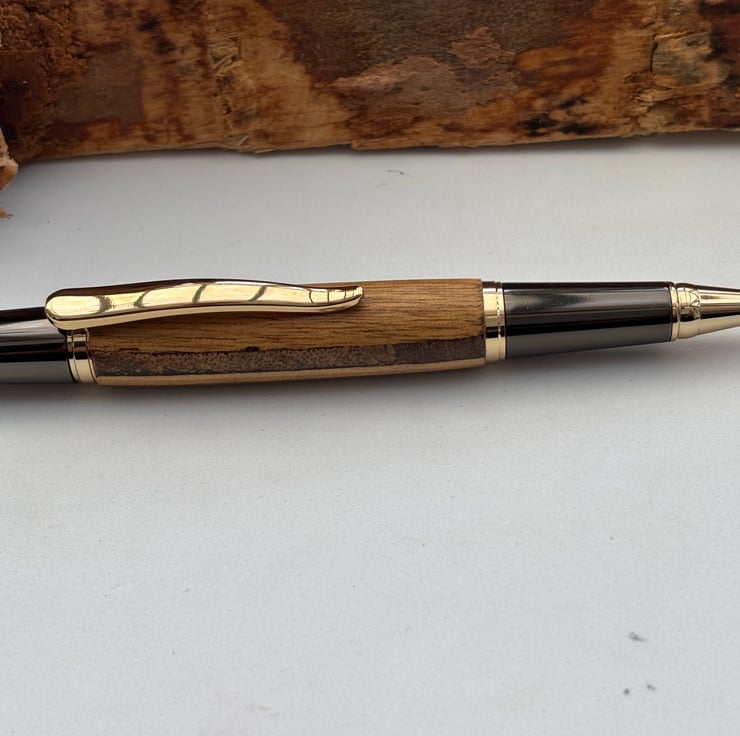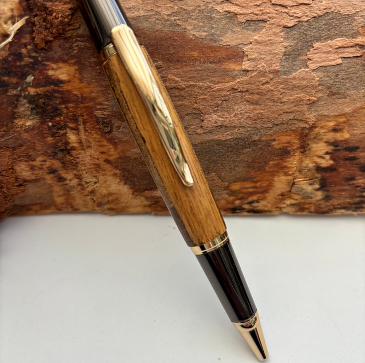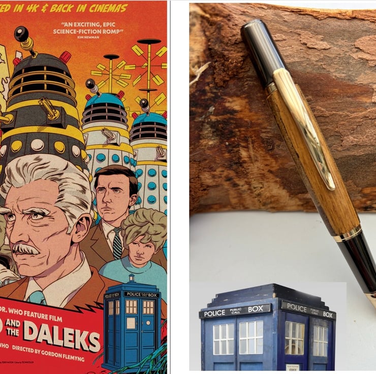 Hand crafted Ballpoint Pen made with genuine Dr Who Tardis wood from 1965 Peter Cushing Film "Dr Who and the Daleks". Certificate included. Gold and gunmetal pen fittings from premium supplier of pen parts “Beaufort Ink”, with black or blue ink Parker style refill. Made from plywood section of Tardis, finished in wax and shellac polish.