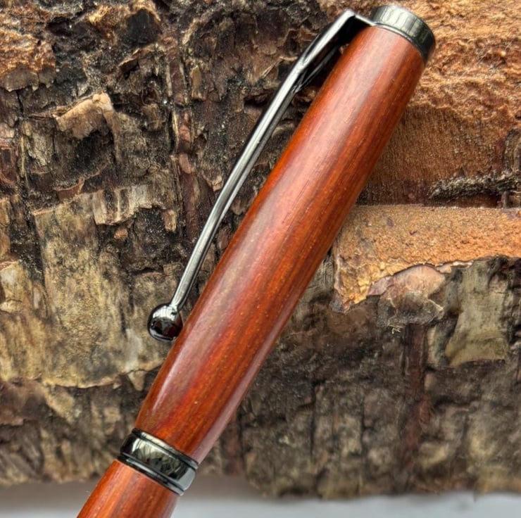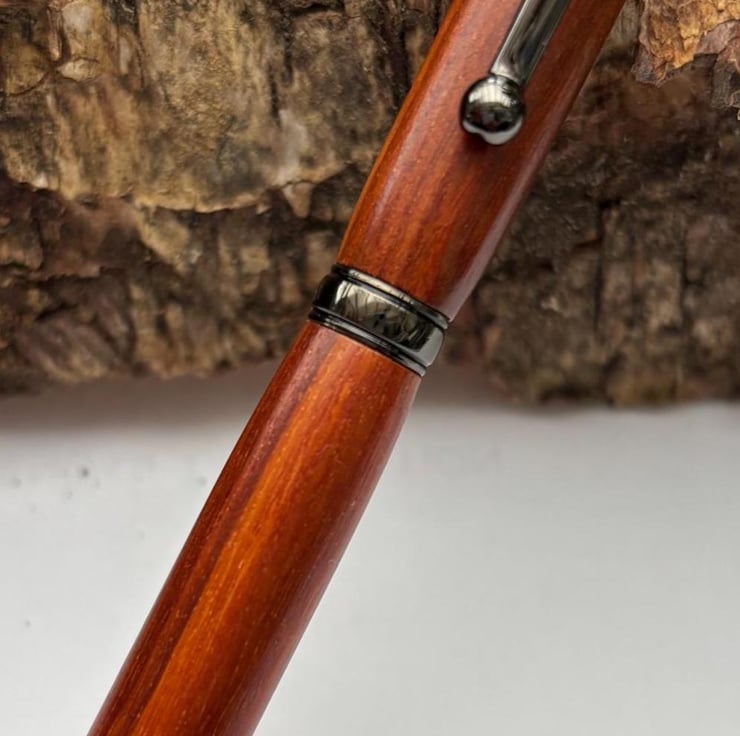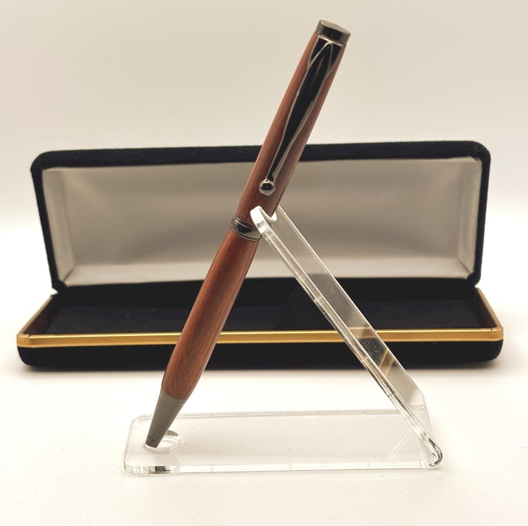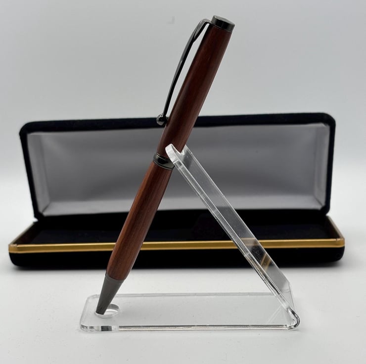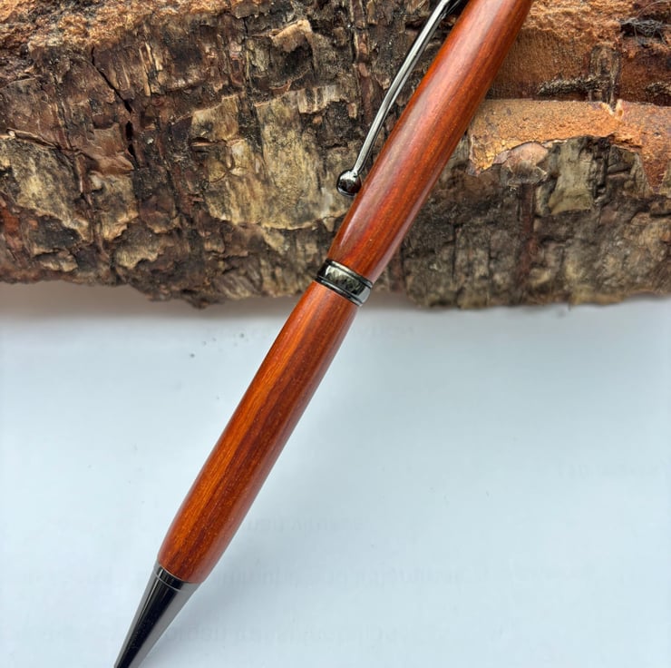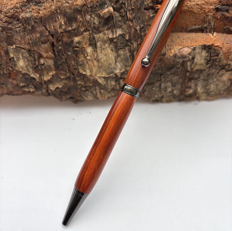 Slimline ballpoint pen, twist action ballpoint, black ink, handmade in my own workshop. Gun metal fittings protected with lacquer for a hard wearing finish then finished with a wax polish for a luxurious feel when writing. Impressive grain pattern makes unique gift.