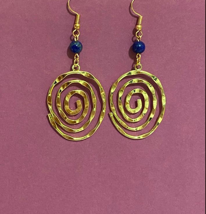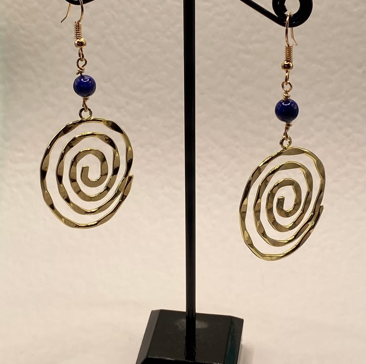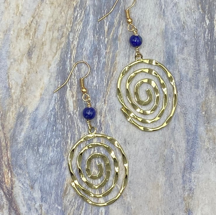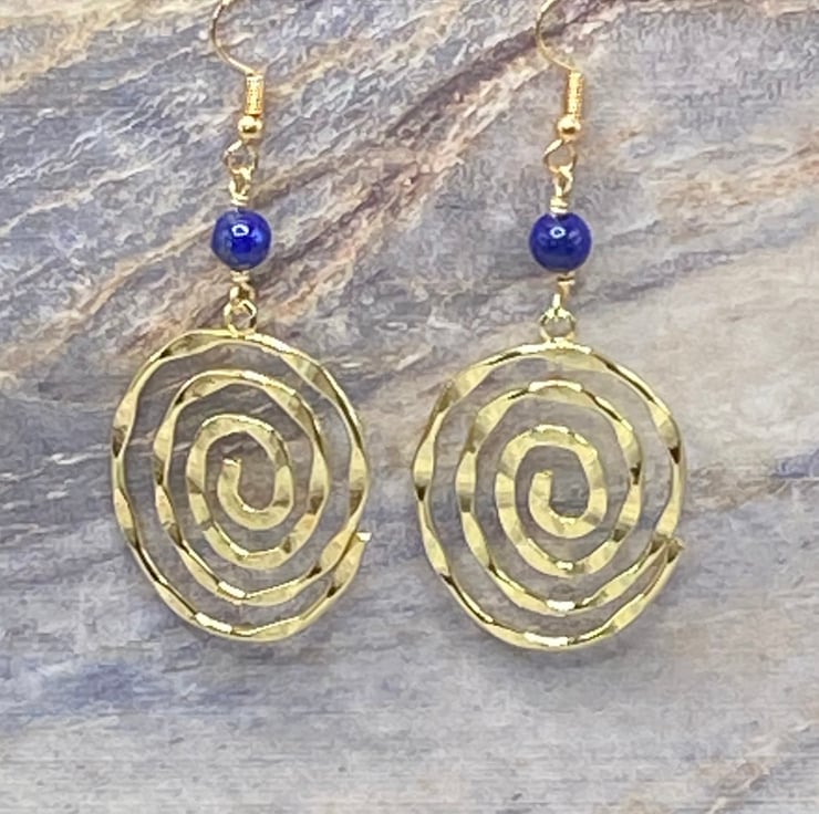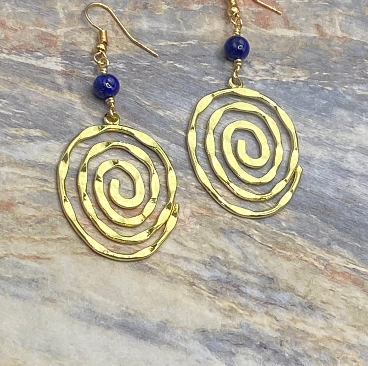 A pair of bold gold tone statement spiral charm earrings topped with 6mm lapis lazuli stones, linked together using gold coloured copper wire and matching gold tone hooks.