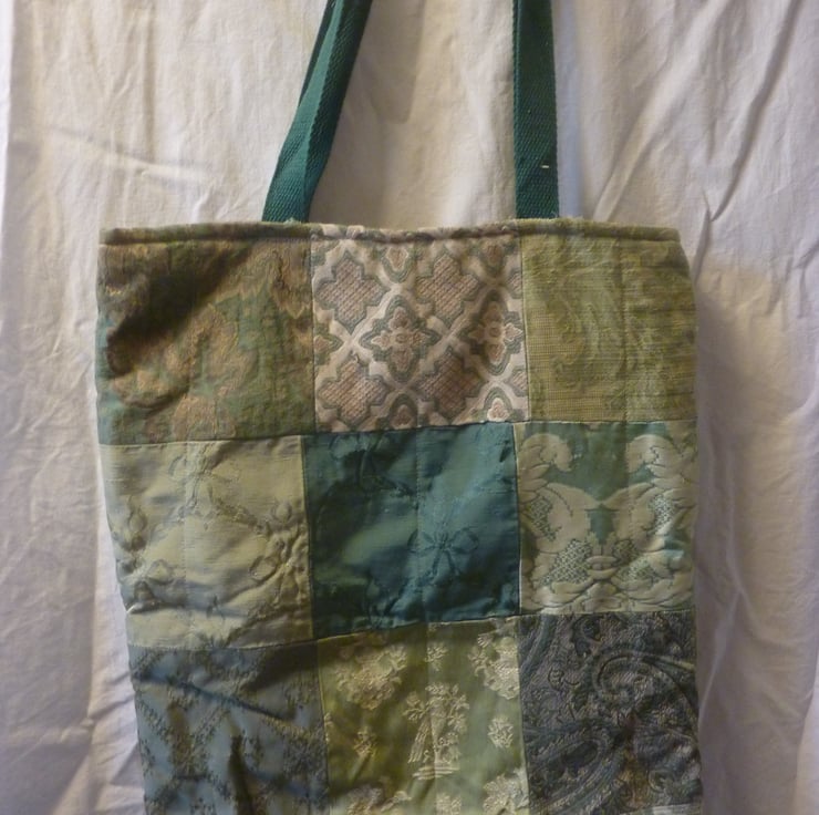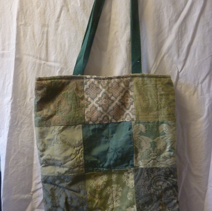 Green Designer Fabric Tote Bag Luxery Patchwork Padded Quited Lined Pocket Zip