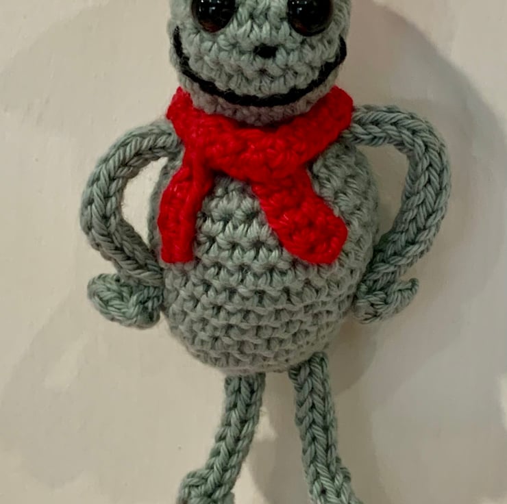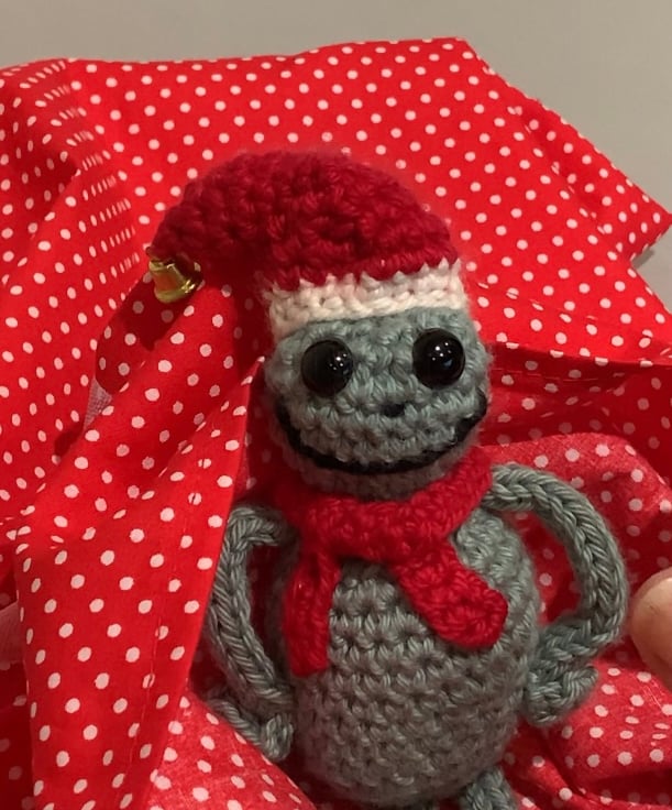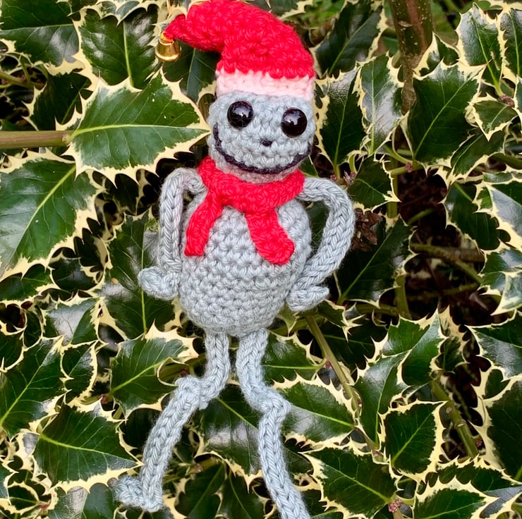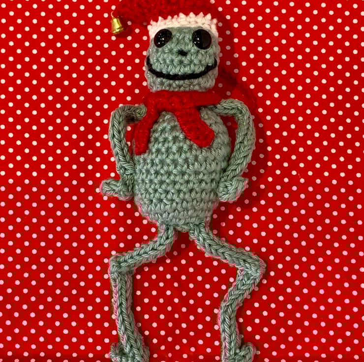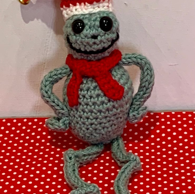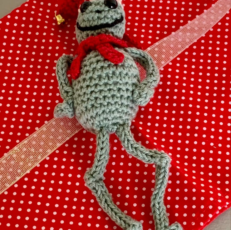 An alternative Christmas Jumper! This Festive Frog Christmas Decoration is very jolly in his Christmas hat, cosy red scarf, and big grin.He is hand crocheted and measures 20cm long. He will cause amusement hanging from the Christmas tree or sat on the mantelpiece. He comes in a Christmas fabric bag.This is not a toy.