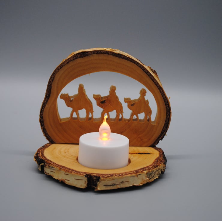 Handcrafted wooden tea light stand - 3 Wise Men on Camels.