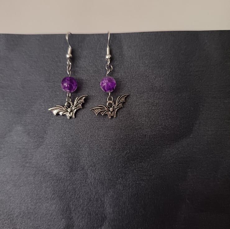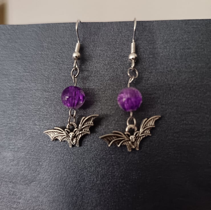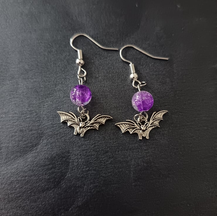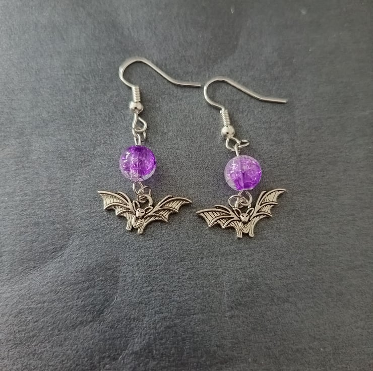 These handmade earrings are crafted with sterling silver bat charms, stainless steel hooks and purple glass beads.
