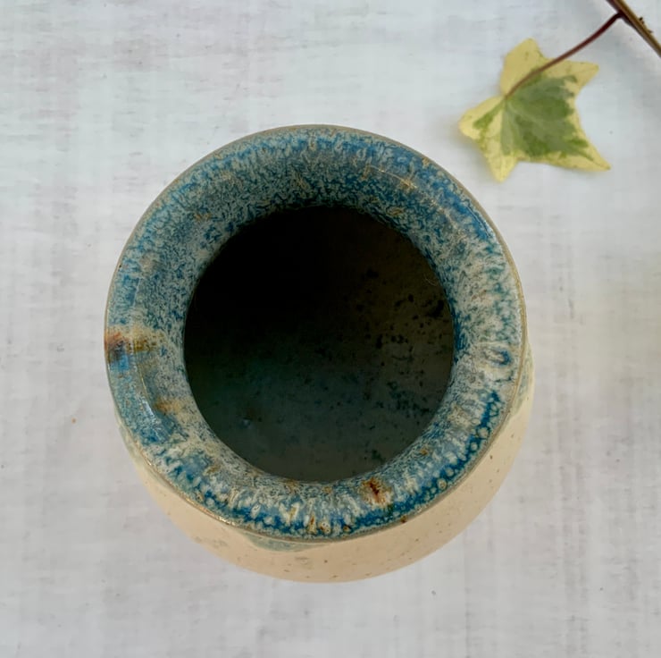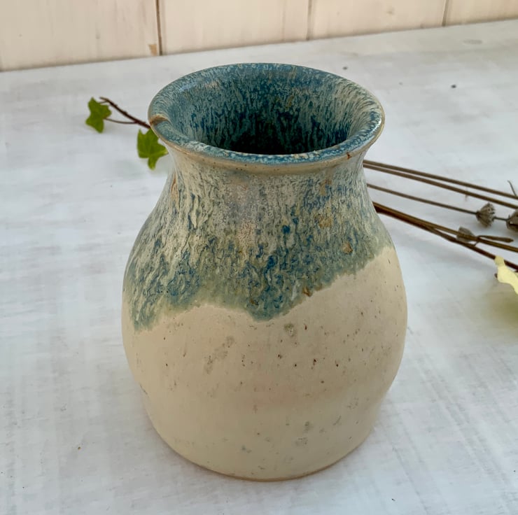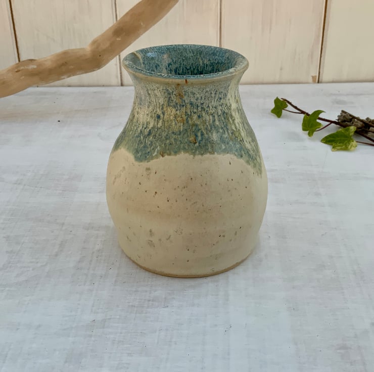 A beautiful wheel-thrown bud/small vase with a soft, natural coastal feel. Finished with Shipwreck & Sea Salt glazes, which flow down the piece giving a mottled blue and cream speckled effect. Perfect for a few garden stems or dried grasses, it adds a calm, handmade touch to any space. Each stoneware vase is unique, shaped and glazed by hand.