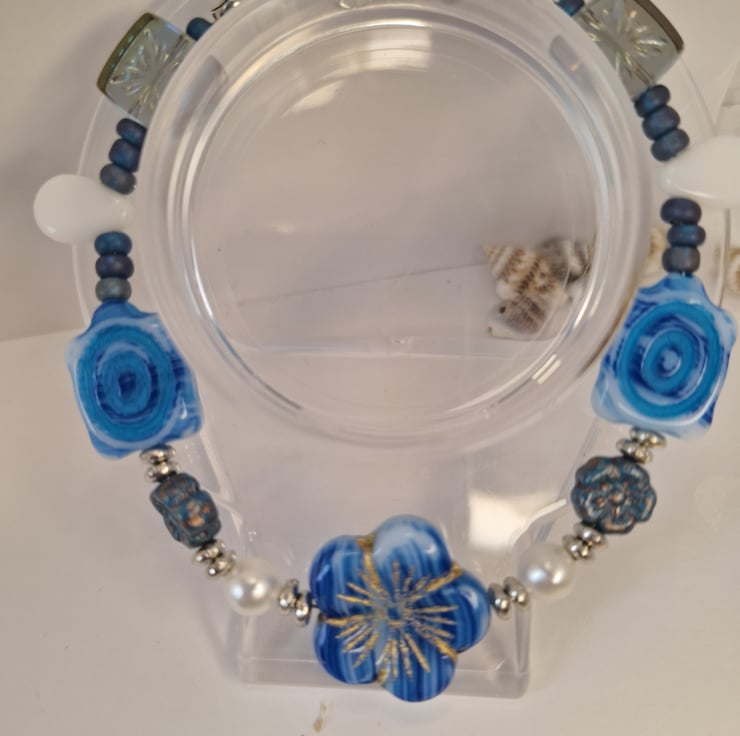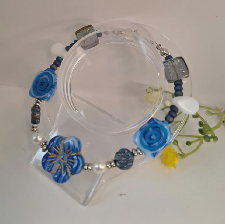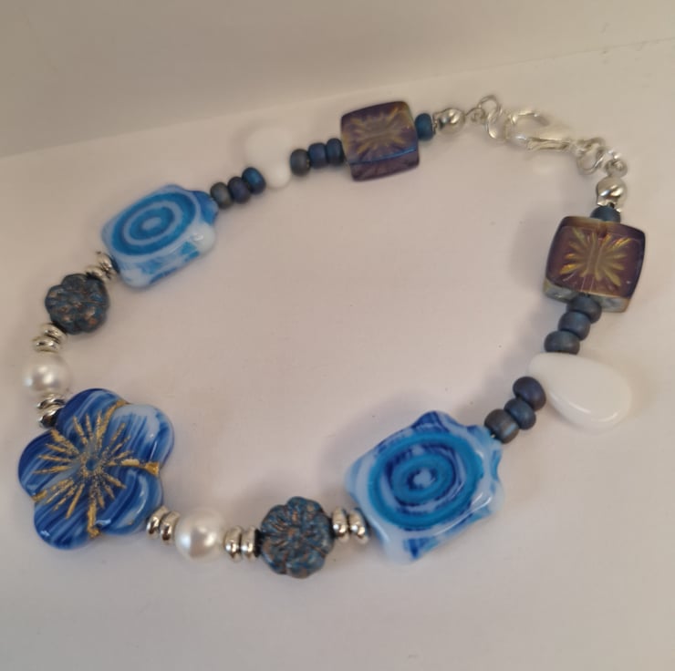 This is a beautiful handmade beaded bracelet featuring a mix of blue, white, and silver tones. The bracelet includes several types of beads:
