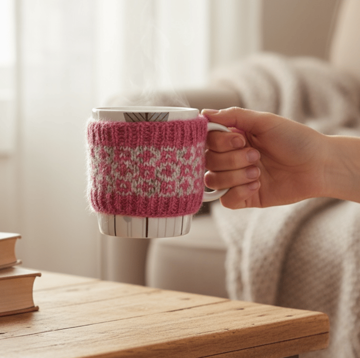 Sheep Mug cozy , handknit fair isle cup cosy . The geometric design to me looks like rows and rows of sheep :) don't you think? . Lovely 100% wool mug hug . Gorgeous kitchen gift. This is a small size mug cosy in pink and cream