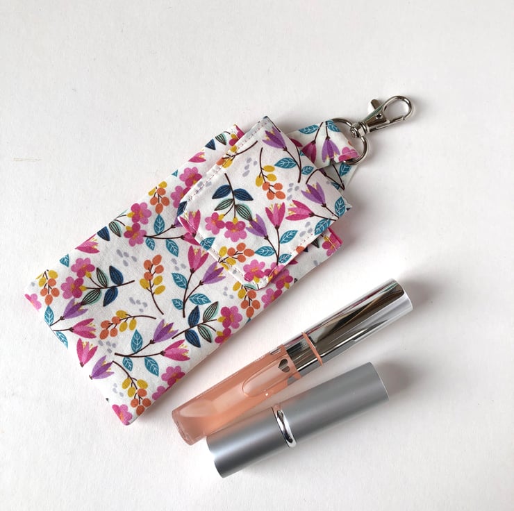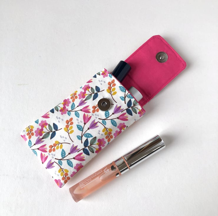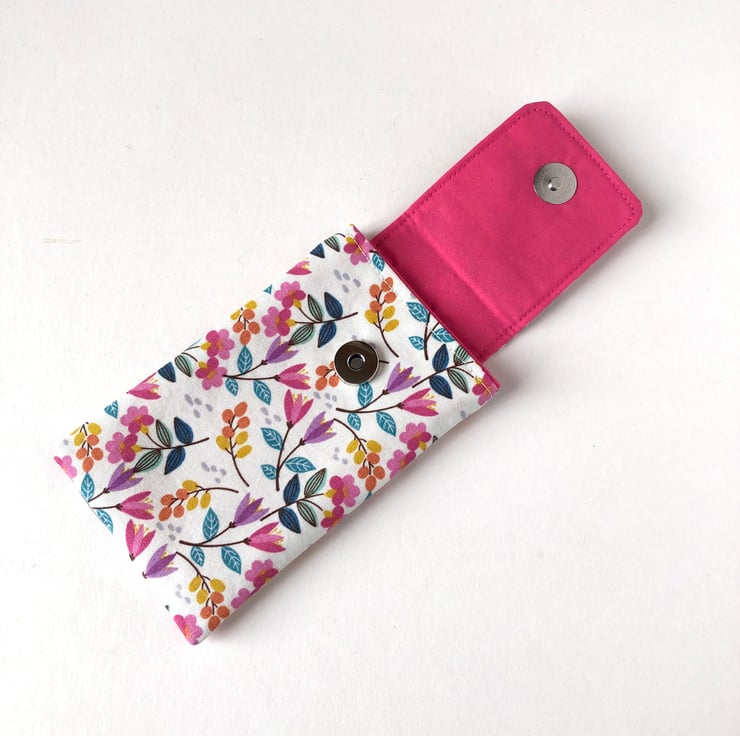 I have made this pretty little pouch in a cream fabric with dark pink and lilac flowers, teal green leaves and yellow/orange details. It has a co-ordinating pink lining.