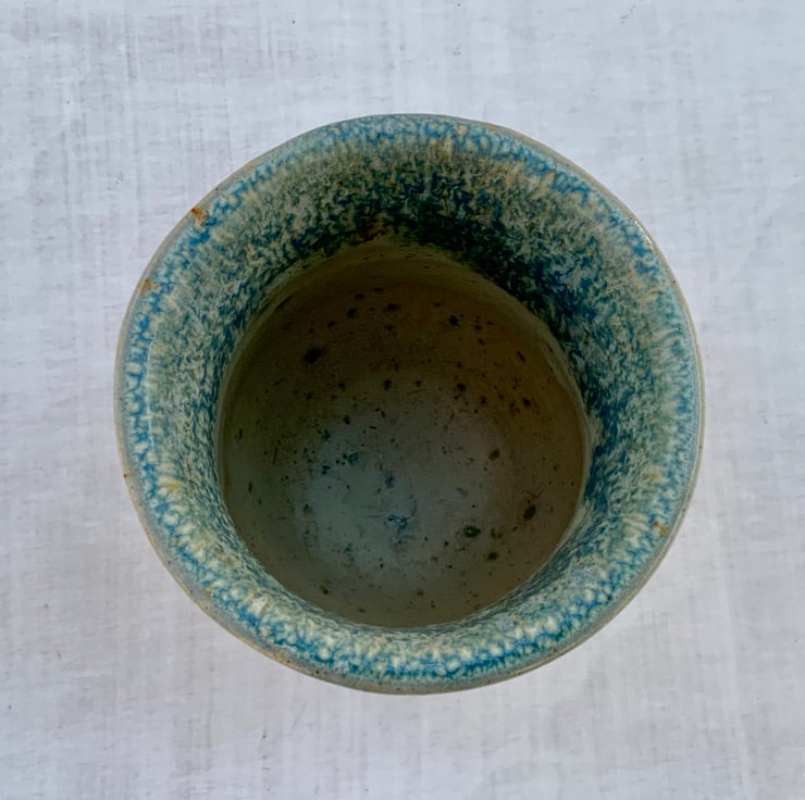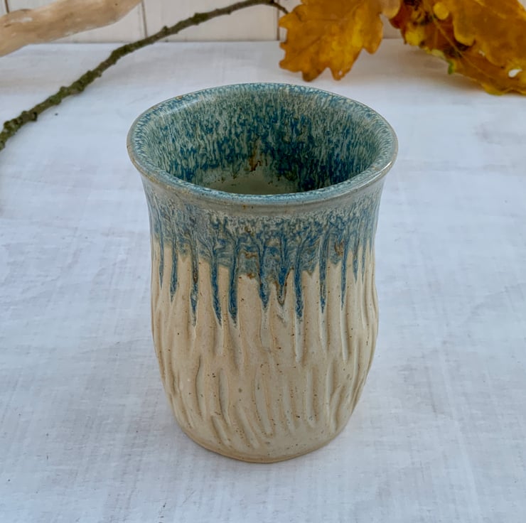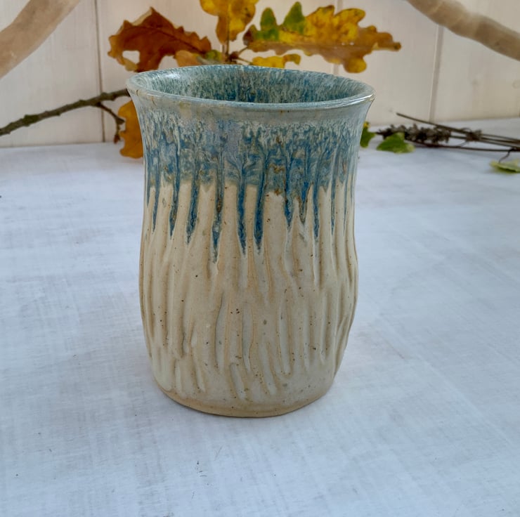 A beautiful wheel-thrown bud/small vase with a soft, natural coastal feel and hand sculpted sides. Finished with Shipwreck & Sea Salt glazes, which flow down the piece giving a mottled blue and cream speckled effect. The sides have been Perfect for a few garden stems or dried grasses, it adds a calm, handmade touch to any space. Each stoneware vase is unique, shaped and glazed by hand.