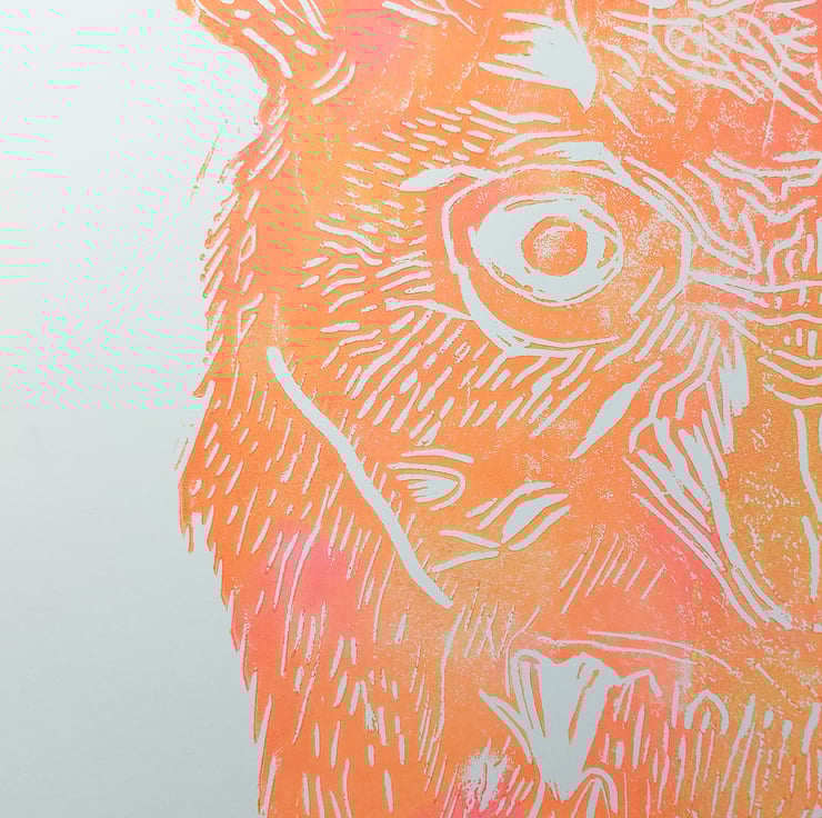This portrait lino print of a screech owl, came into my head one day. Rather than feature the whole face, I thought just having it half visible would be interesting. I love using neon colours in my prints, and I thought neon, coupled with the perpetual 'night owl', made a great match.