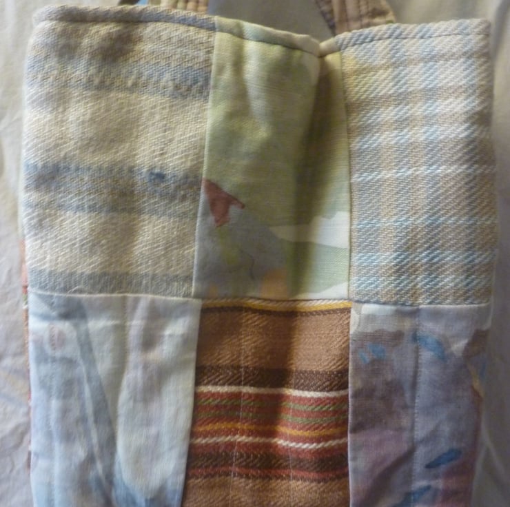The patches are approx 6X4 inches 15X10cms (yes I know, 'approx' being an anathema to serious patchworkers). All the fabrics are highend designer printed and woven linen. Bag is padded and quilted and this wee tote bag is lined in colourful printed cotton with one inside pocket. The handles are quilted and padded and are 22inches,56cms, long enough to be used as a shoulder strap or not as you prefer. There is a 3 inch, 7.5cms bottom boxed base. Finished size 12X11 inches 31X28cms.
