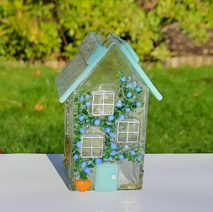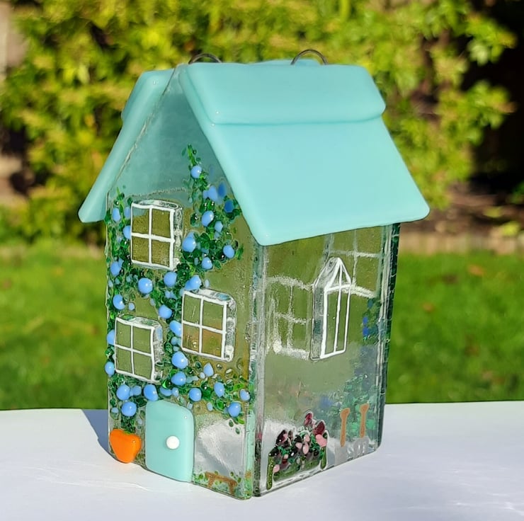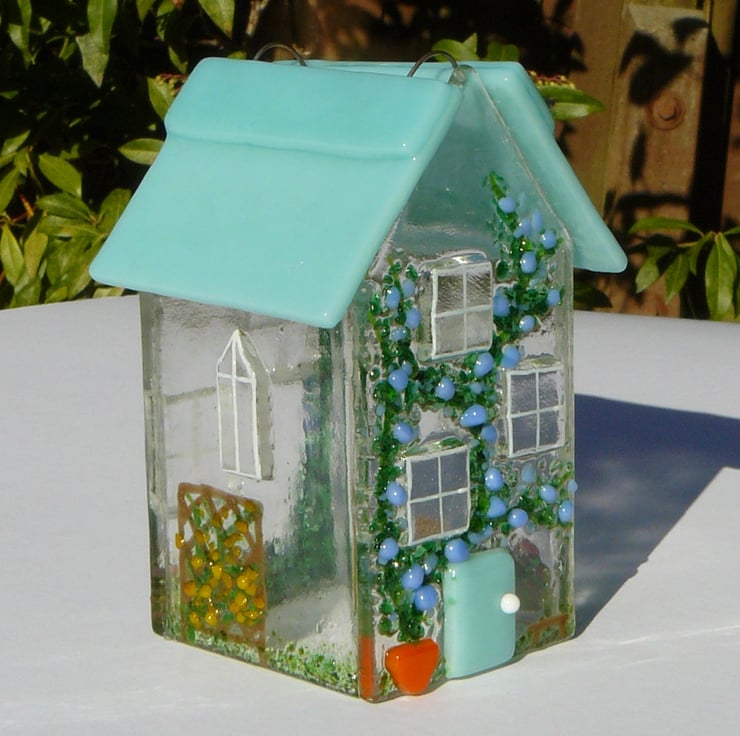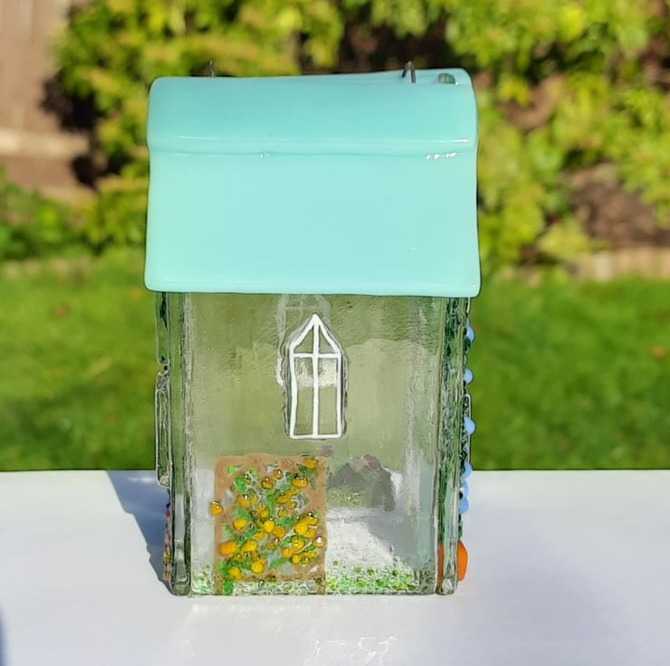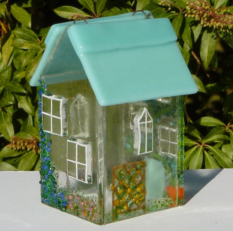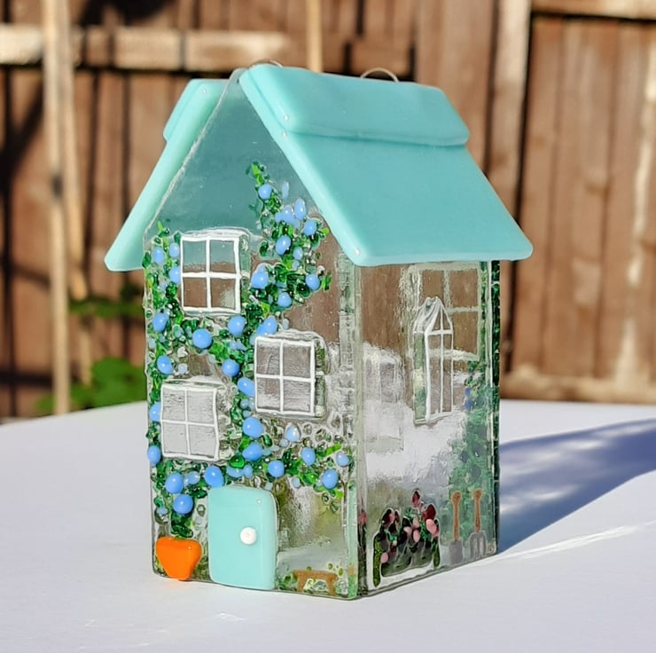 Made of four glass panels and a glass roof this house is full of detail. The roof and front door are the same colour and the flowers around the house range from blue to fuscia, pink and plum to yellow and pumpkin orange. There are four different shades of green glass used to make the grass and leaves of plants giving lovely texture. There's evidence of gardening with a fork and spade alongside a planter on one side and a trellis on the other side.
