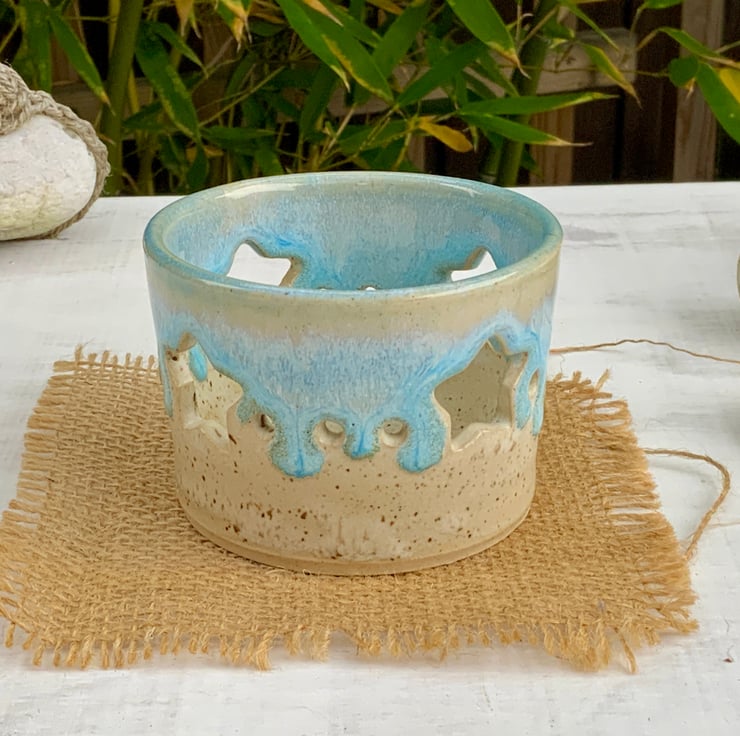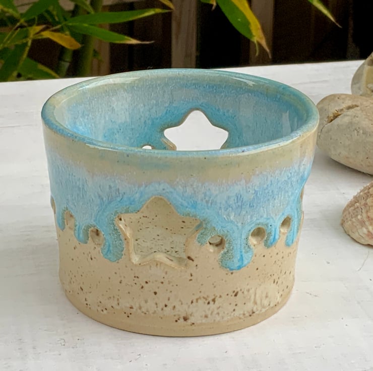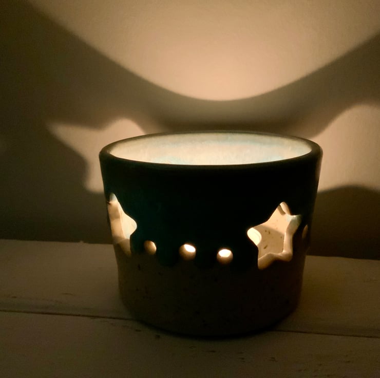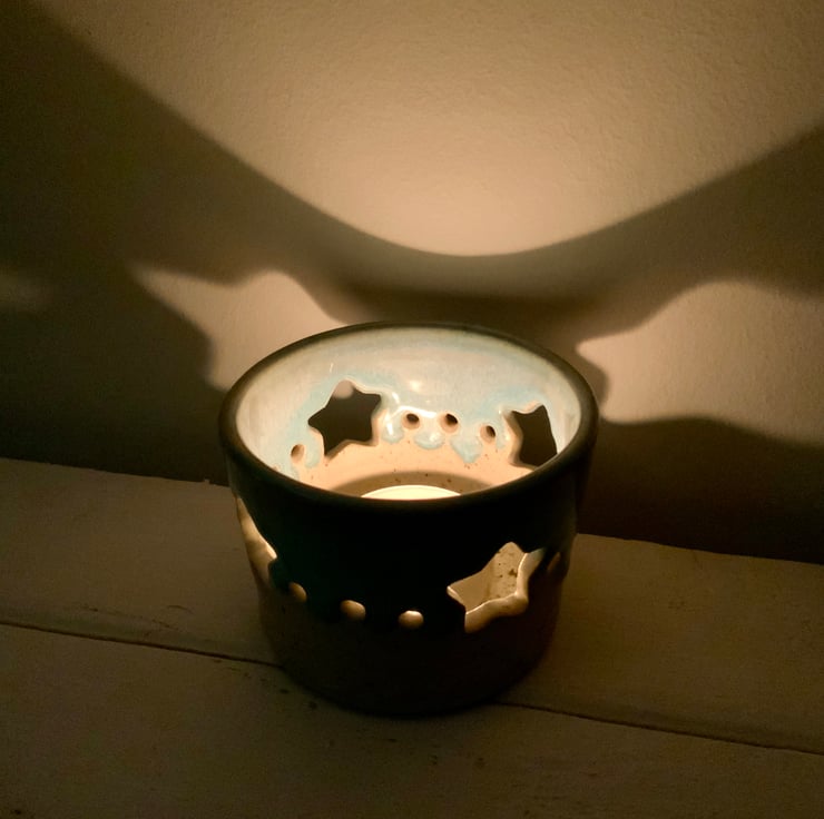 Bring a touch of charm to your home with this hand thrown candle holder. Lovingly crafted on the wheel using stoneware clay and finished in a blend of Winter Wood and Norse Blue glazes. Hand-cut star windows cast a gentle flicker of candlelight, filling your space with warmth and calm.