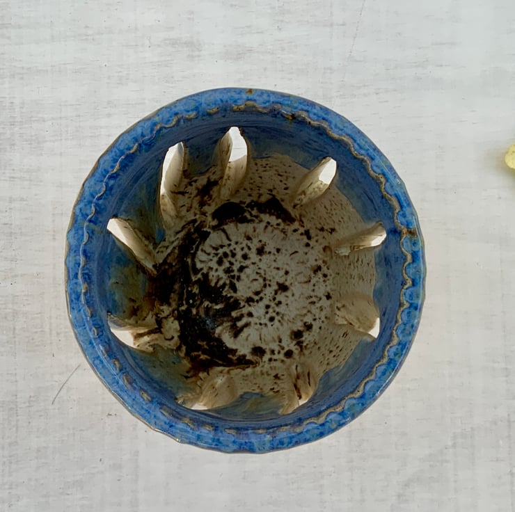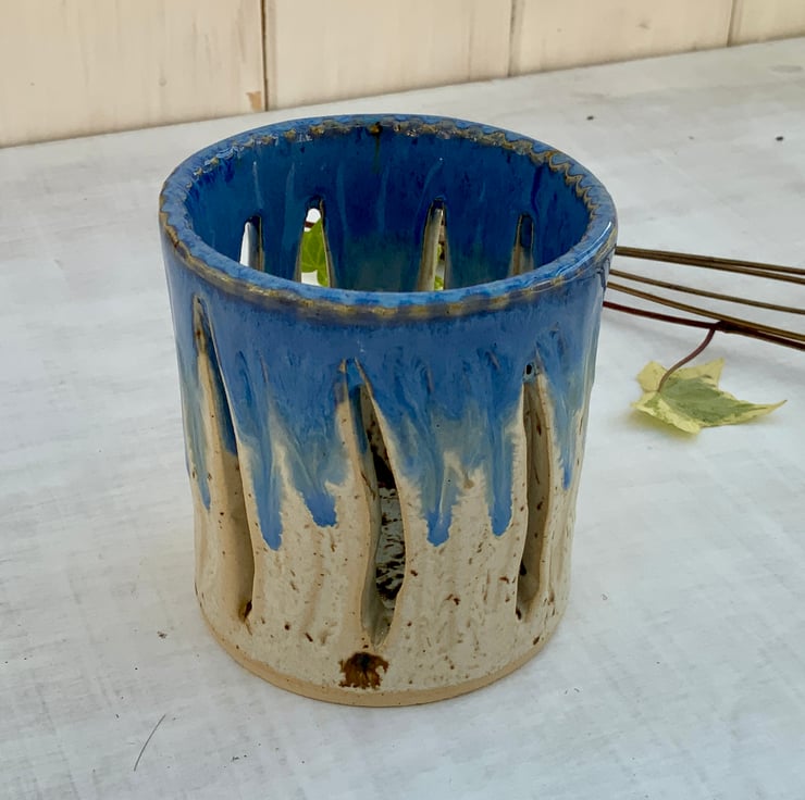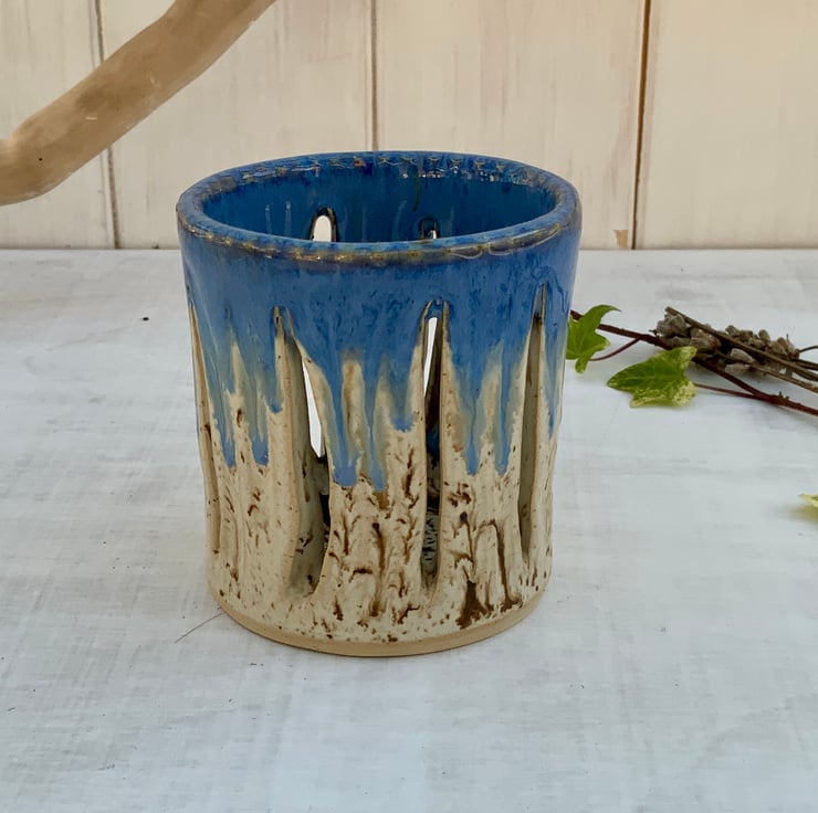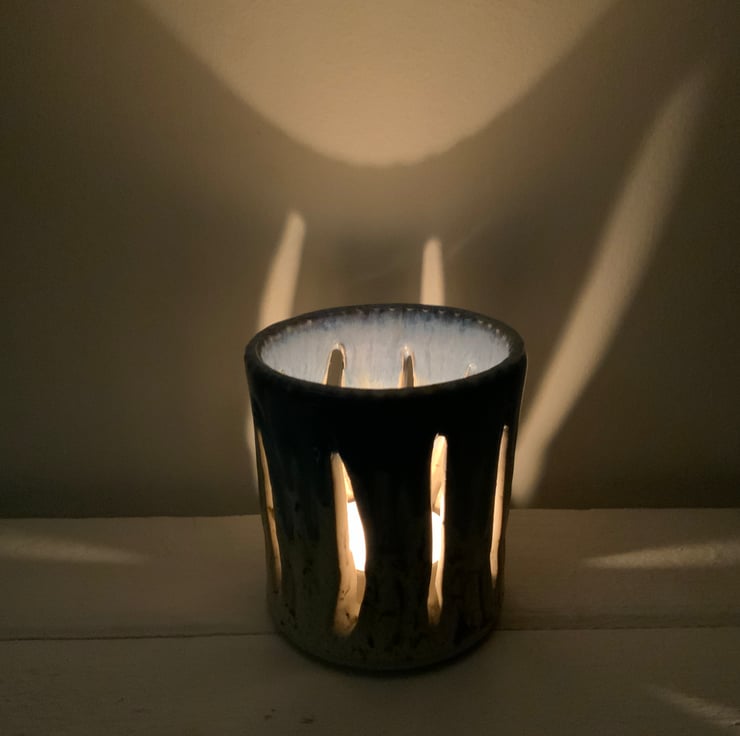 Bring a touch of charm to your home with this hand thrown candle holder. Lovingly crafted on the wheel using stoneware clay and finished in a blend of Winter Wood and Midnight Rain glazes. Hand-cut flame shape windows cast a gentle flicker of candlelight, filling your space with warmth and calm. Perfect for tealights or small candles.