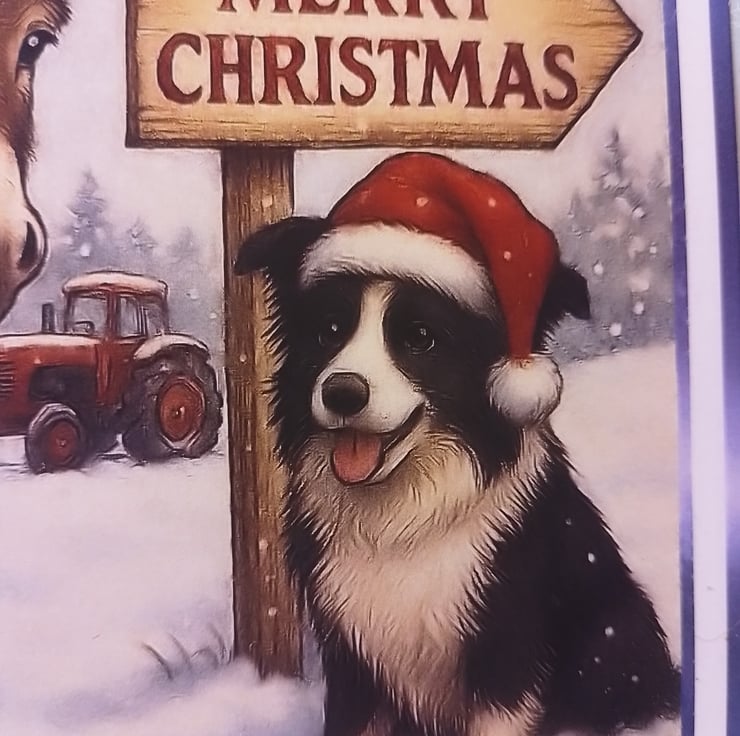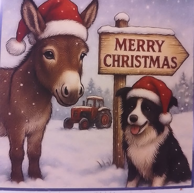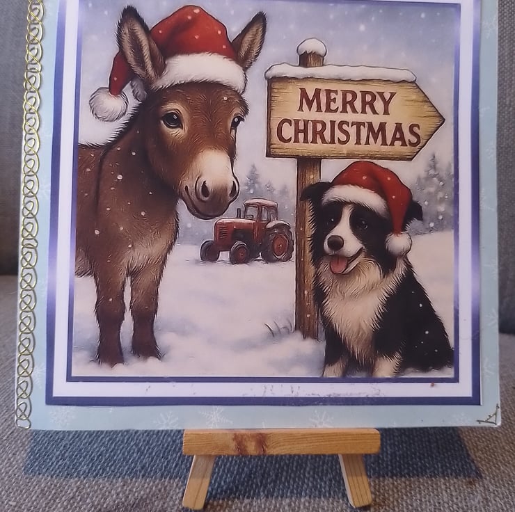 a 8 x 8 card showing a dog and donkey with their hats on in the snow, all cards come with a matching envelope and cellophane wrapped to keep it clean