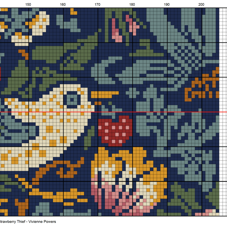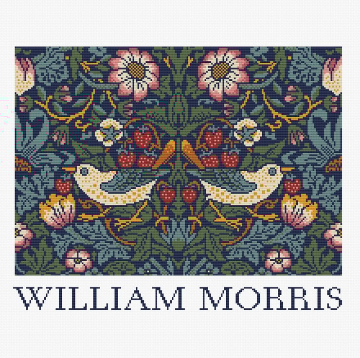 Cross Stitch Strawberry Thief William Morris Arts and Crafts textile Thrushes at Kelmscott Manor chart by Vivsters PDF counted chart 330.