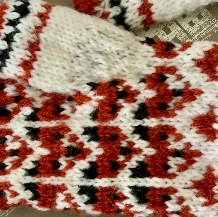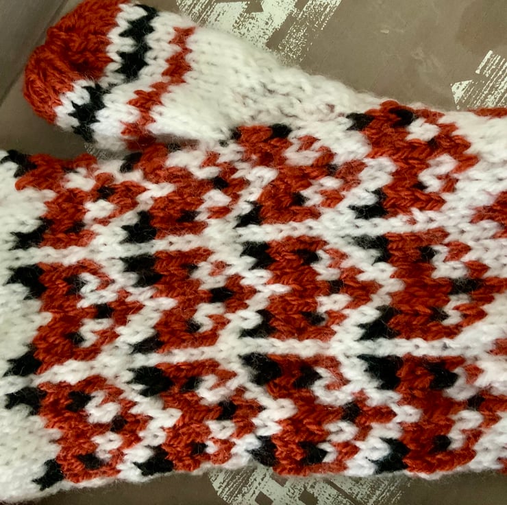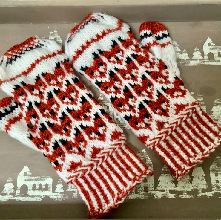 Measurements: length approx 24cm / 9.5”; circumference of mitten above thumb approx 21cm / 7.25”; wrist circumference approx 17cm / 6.75” before stretch; cuff length approx 7cm / 2.25”