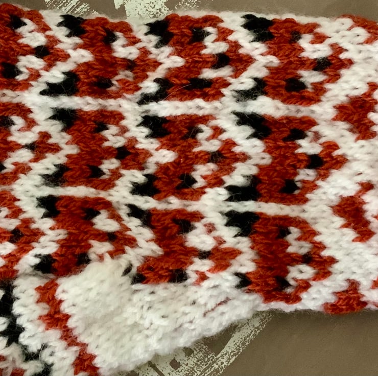 Front and underneath have the same repeating motif. The top features a chequered pattern and the thumb has two bands of rust and black against the white background