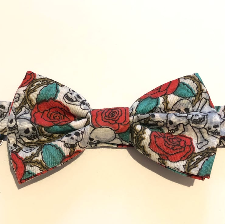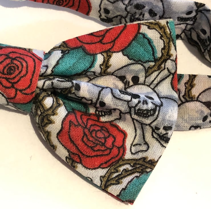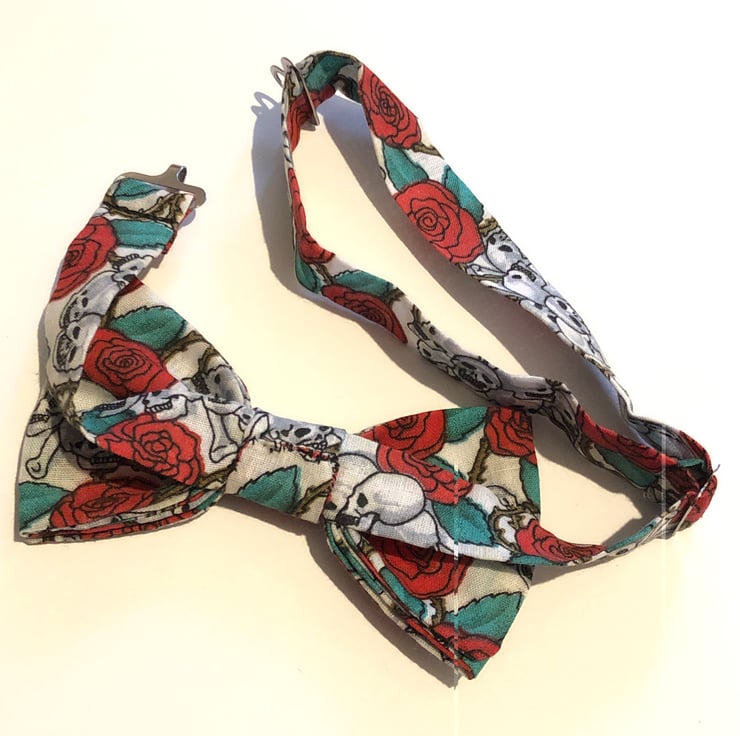 Unleash your alternative style with this skull and roses print fabric, adjustable bow-tie. Perfect for parties, work, or even a wedding! Buy for yourself or for that special someone you know deserves it!