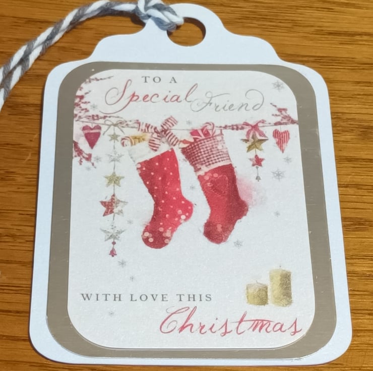 Pearlescent gift tag featuring Christmas Stockings with the sentiment "to a Special Friend with love this Christmas."