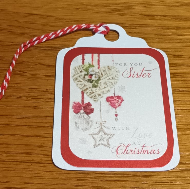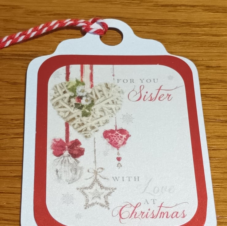 Pearlescent gift tag featuring Christmas decorations and the sentiment "For You Sister with love at Christmas."