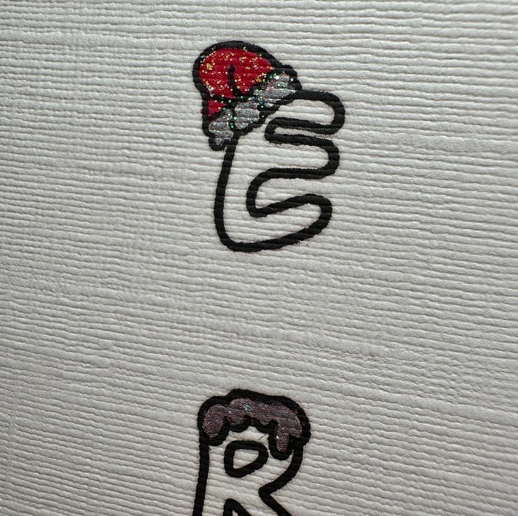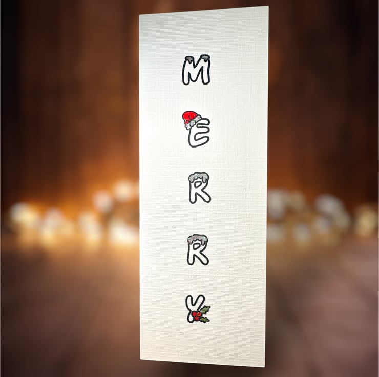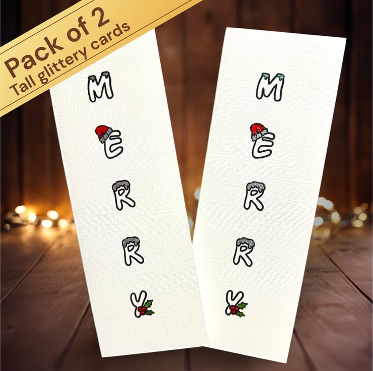 Each has the greeting “MERRY” in large black printed text enhanced with hand painted Santa hats and icy snow capped mountains and pretty holly sprigs, all embellished with glitter which shimmers in different lights.
