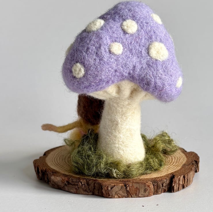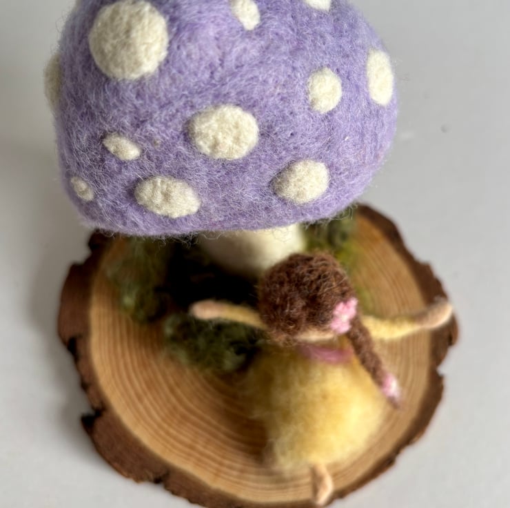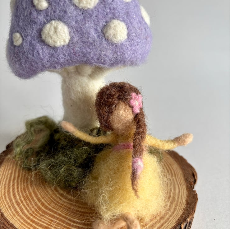 A delightful little fairy girl sitting beneath a giant purple toadstool both made from wool, surrounded by curly foliage and presented on a wooden slice.