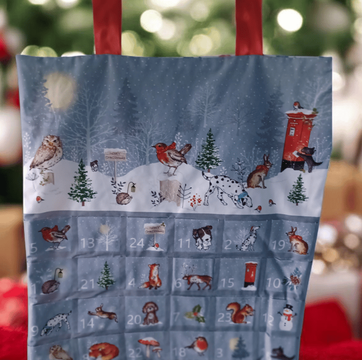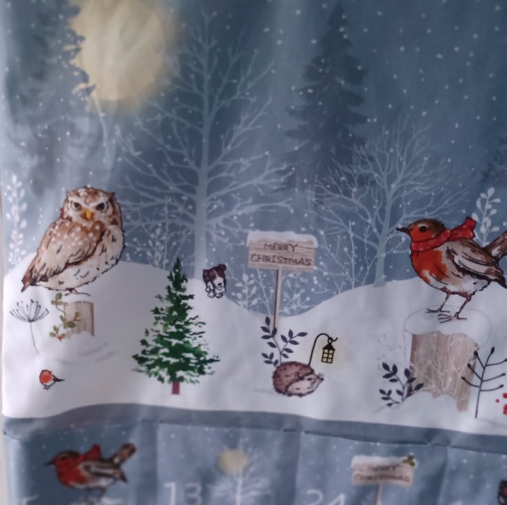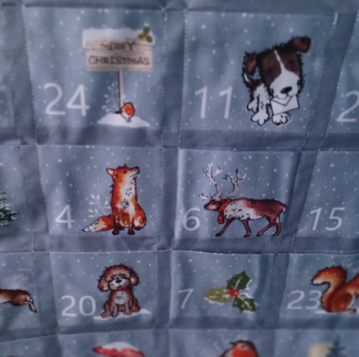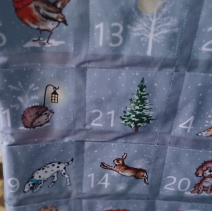 This advent calendar is a blue grey colour with winter wildlife around a Christmas tree and postbox in the snow, it is a beautiful scene. This calendar is padded and lined and has two ribbon loops for hanging. All you need to do is decide what you would like to fill each of the 24 pockets with to make your calendar complete! These calendars can be reused year after year without the need for plastic trays that are found in shop bought ones. Make one of these lovely calendars part of your Christmas traditions.