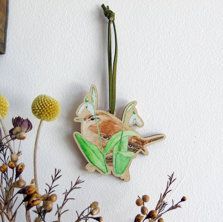 A wooden Christmas tree decoration featuring my original watercolour painting of a cute wren with snowdrop flower and matching card in a letterbox sized parcel, a lovely way to send a gift to those living far away and let them know you're thinking of them at Christmas time and a reminder that spring is around the corner!
