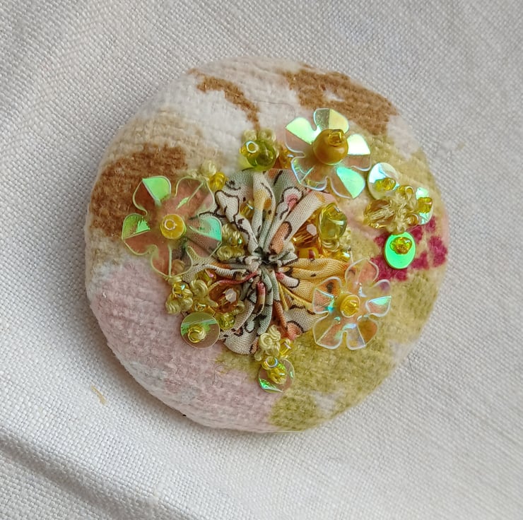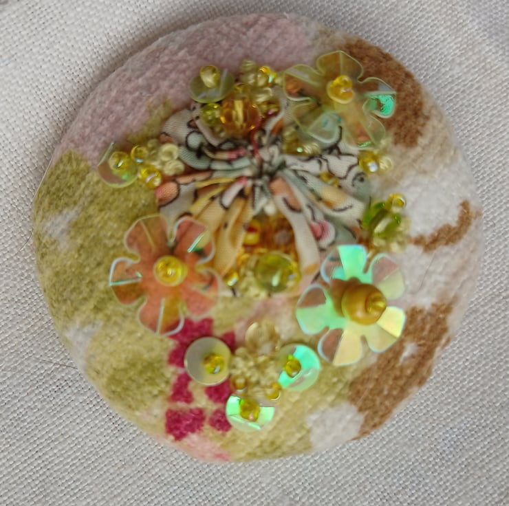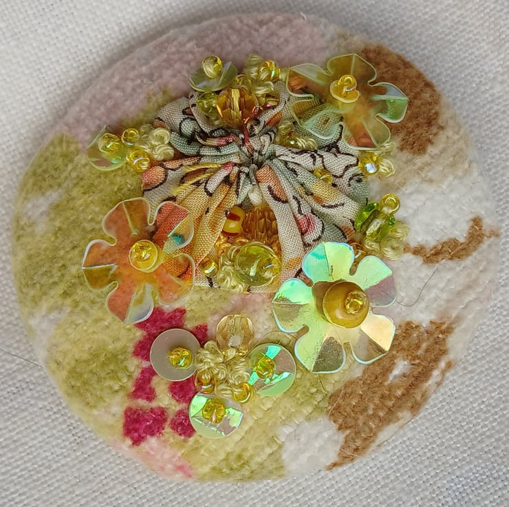 This brooch has been made from an old button that has been covered in a vintage soft floral fabric in muted tones, and backed with vintage linen. To decorate the brooch, I added a small suffolk puff made from a scrap of Liberty fabric in matching tones and added beads, sequins and french knots to complete the brooch decoration. It has a vintage, but new safety pin to attach the brooch to clothing etc at the back, along with an Elsie May and Bertha label.