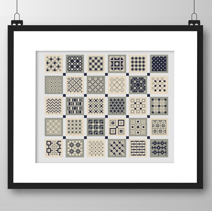 Cross Stitch Stitchery Sampler Macro Squares - Antique tiled patchwork Grey/Blue - Traditional embroidery - Vivsters - PDF counted chart 274A