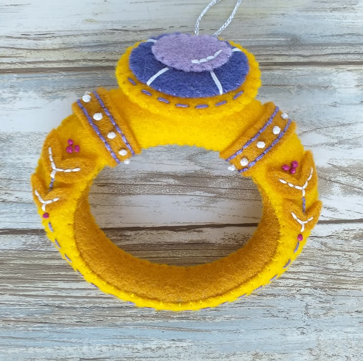 A wool felt Golden Ring Christmas Ornament ready to hang on your Christmas tree