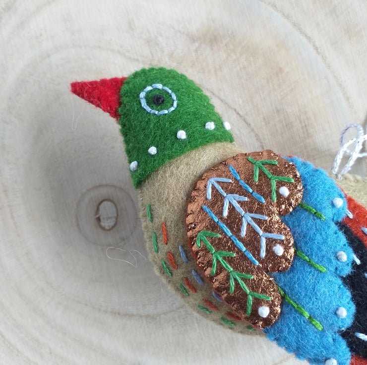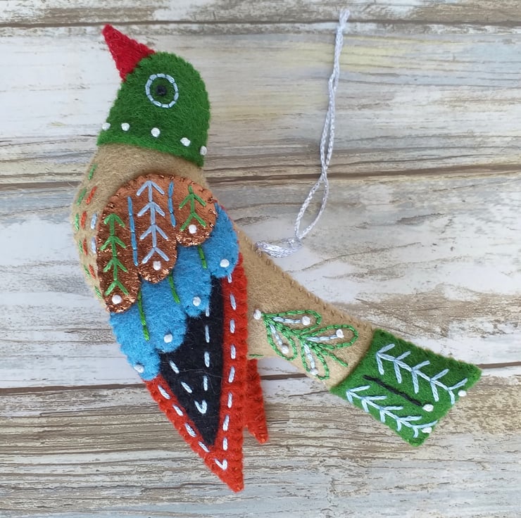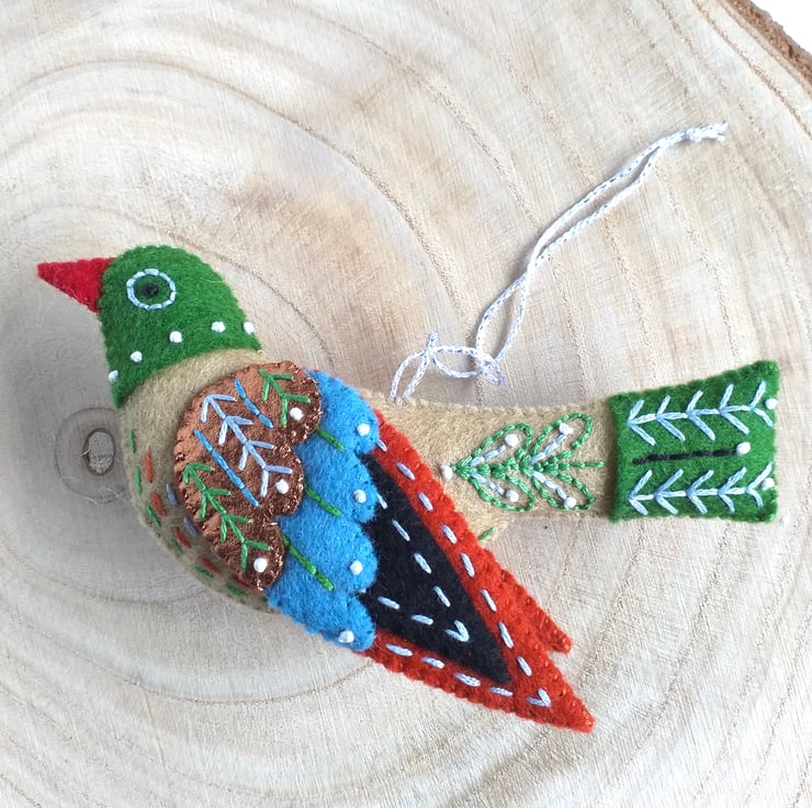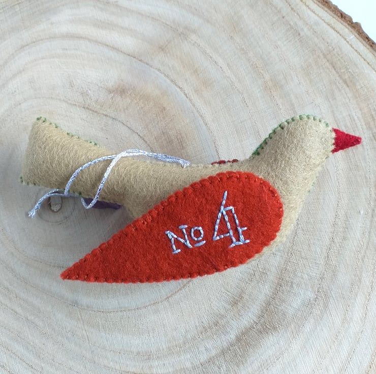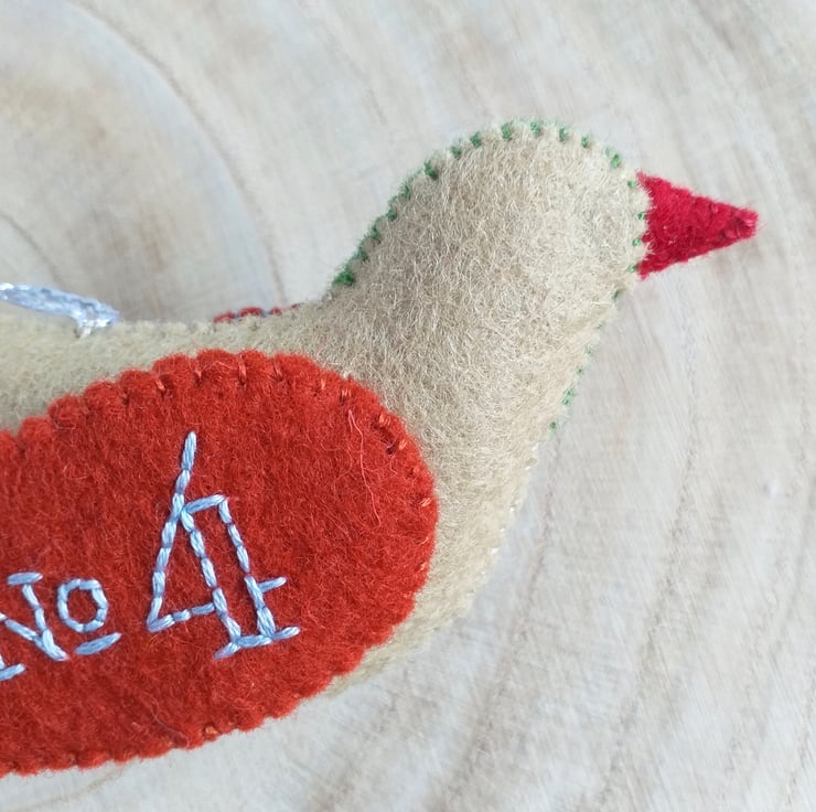 A wool felt Colly Bird Christmas Ornament ready to hang on your Christmas tree