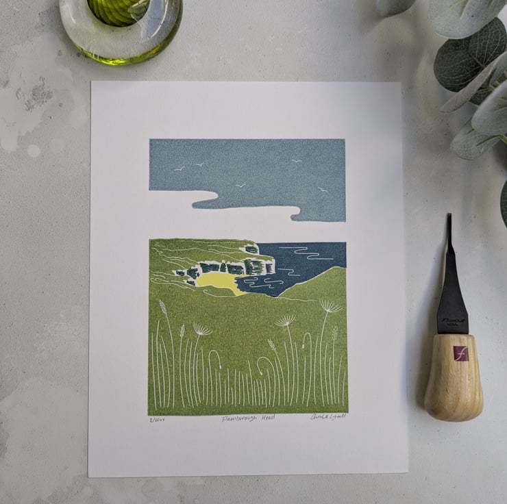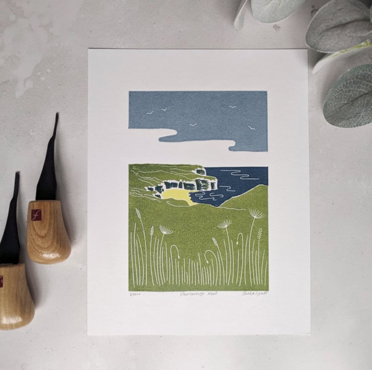 Each design is created using hand carved plate of traditional lino, carved with specialist tools and printed with a hand wound press, using Hawthorn Printmakers oil based inks onto 300 gsm Snowdon printmakers paper. Every print is unique and completely individual due to its handmade nature. It's always so satisfying peeling back to paper to reveal to final print.