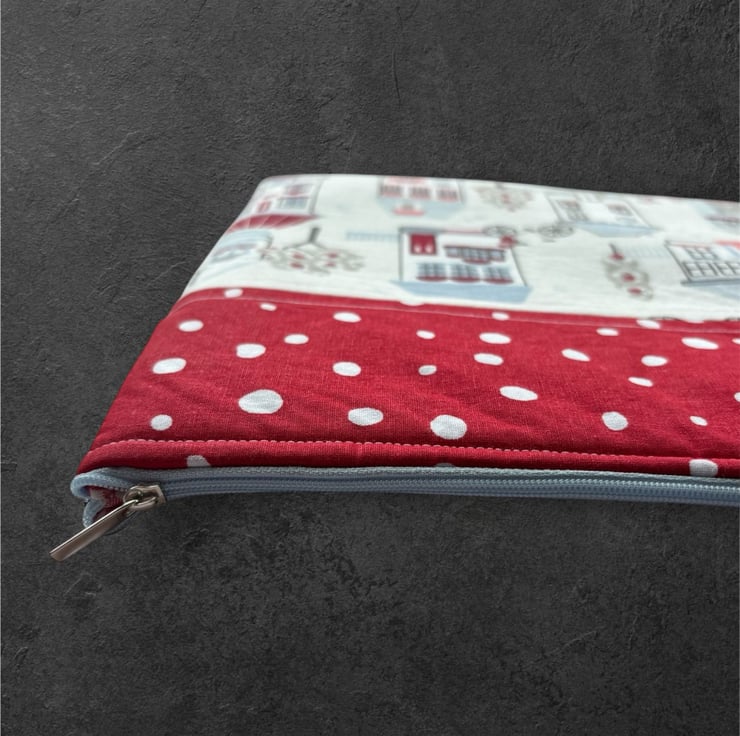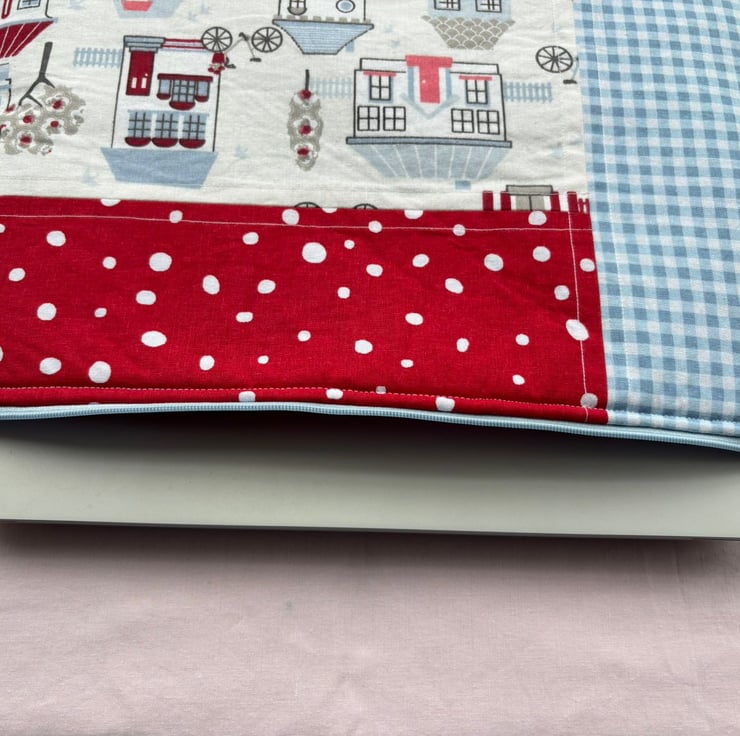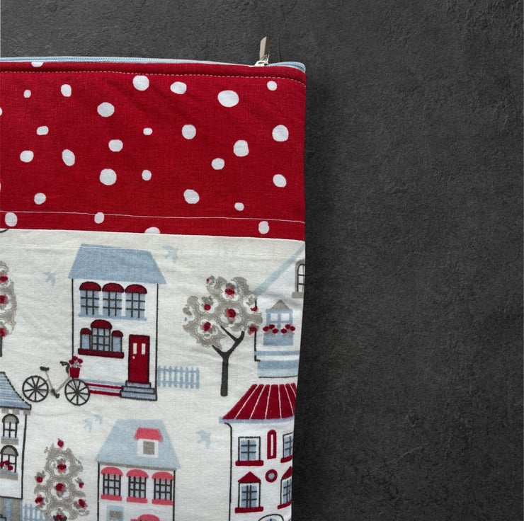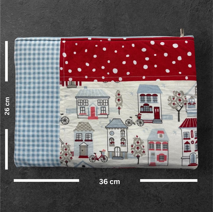 Introducing our charming quilt patchwork laptop sleeve, designed to keep your laptop safe and stylish! Measuring 36 cm x 26 cm, this delightful sleeve is perfect for your 13" or 14" laptops. Made with lovely houses print cotton fabric on the front, it brings a touch of warmth and personality to your tech essentials. The back features a sleek and simple plain black design, ensuring a sophisticated look.