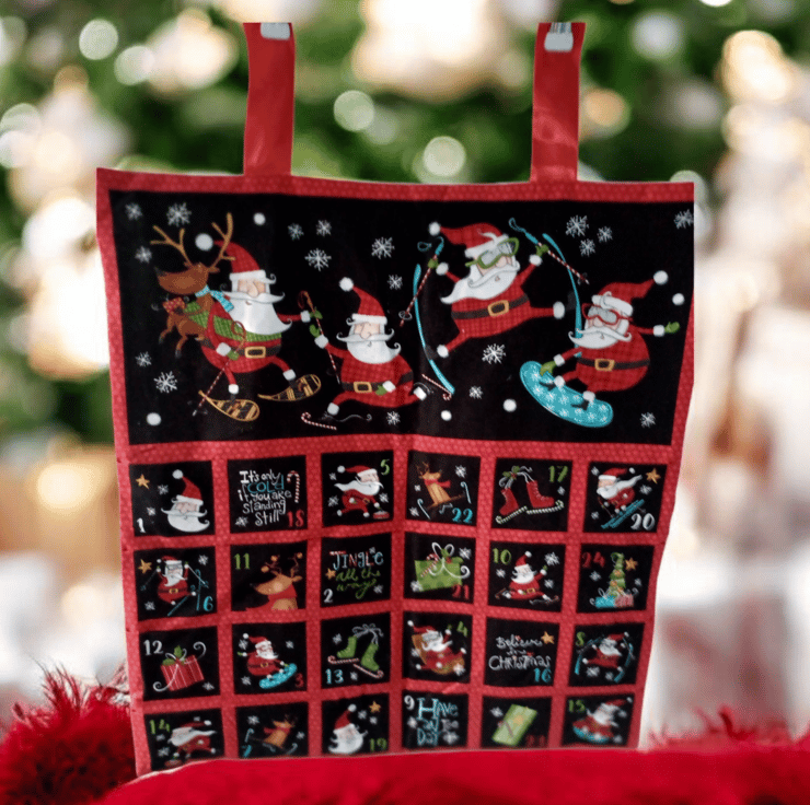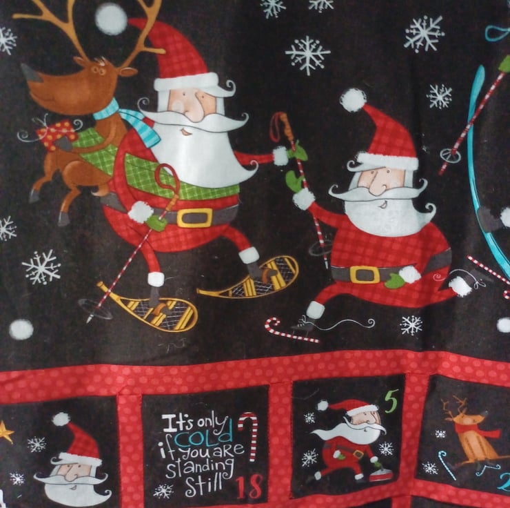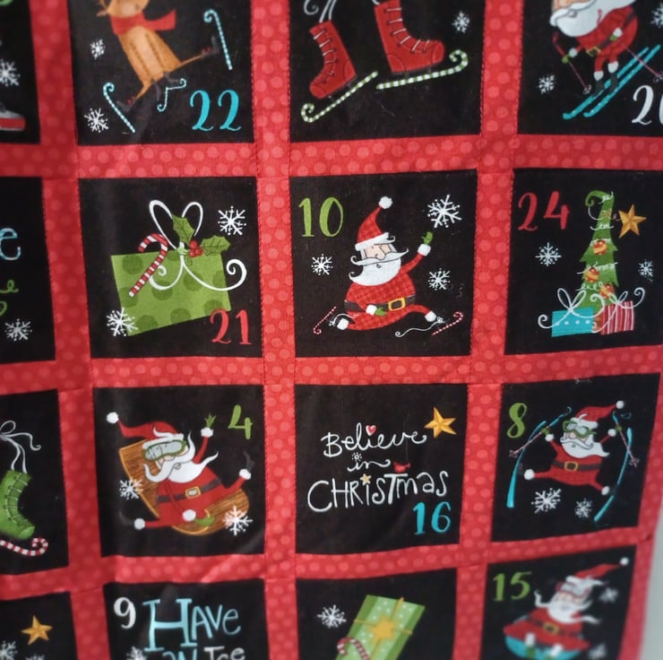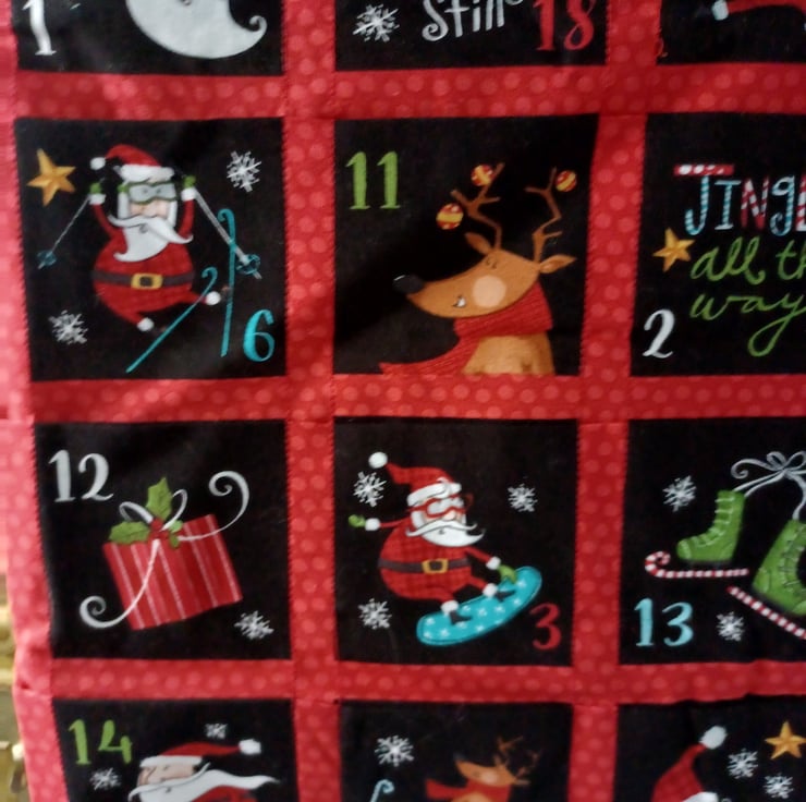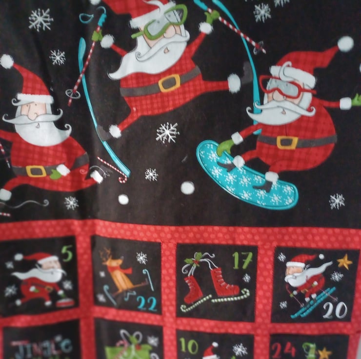 This advent calandar depicts a group of Santa's dancing and partyingwith their reindeer, it is a really fun scene. This calendar is padded and lined and has two ribbon loops for hanging. All you need to do is decide what you would like to fill each of the 24 pockets with to make your calendar complete! These calendars can be reused year after year without the need for plastic trays that are found in shop bought ones. Make one of these lovely calendars part of your Christmas traditions.