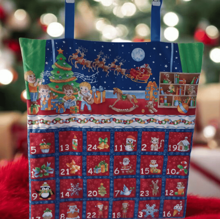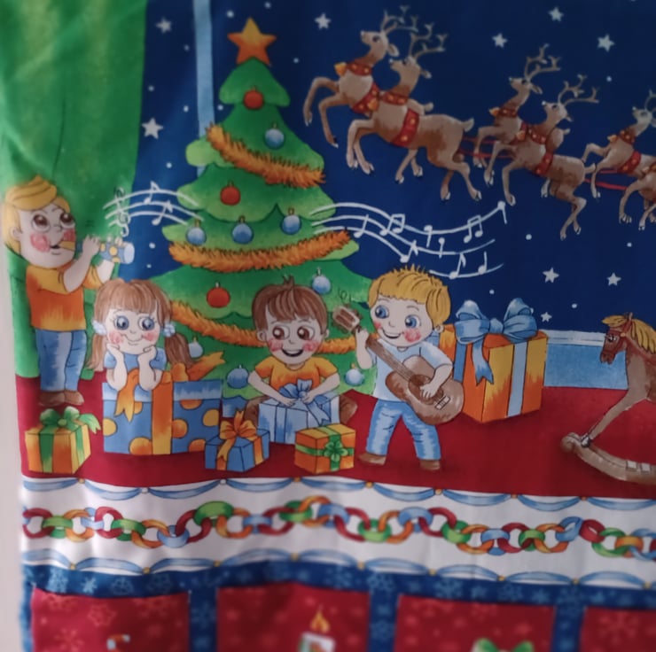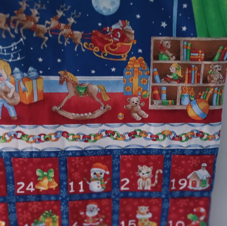 This advent calandar depicts children sat aroundthe Christmas tree, lookingat their presentsas santa and his reindeerfly away out the window, it is a lovely festive scene. This calendar is padded and lined and has two ribbon loops for hanging. All you need to do is decide what you would like to fill each of the 24 pockets with to make your calendar complete! These calendars can be reused year after year without the need for plastic trays that are found in shop bought ones. Make one of these lovely calendars part of your Christmas traditions.