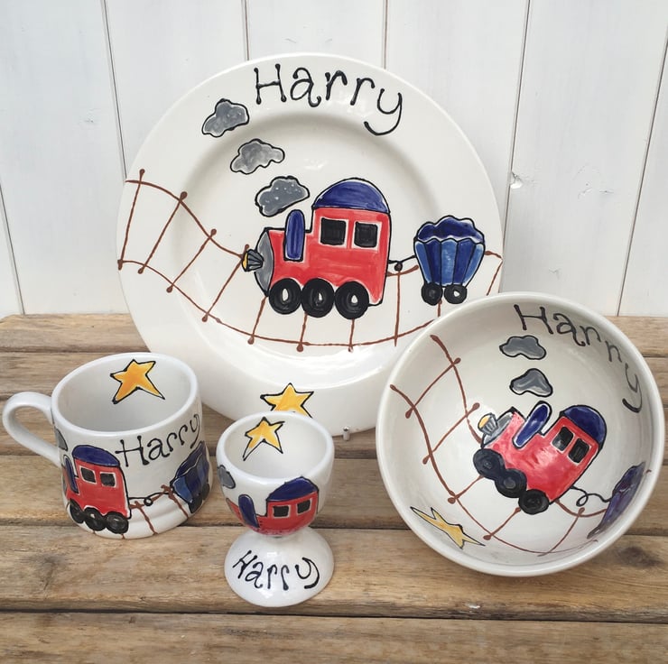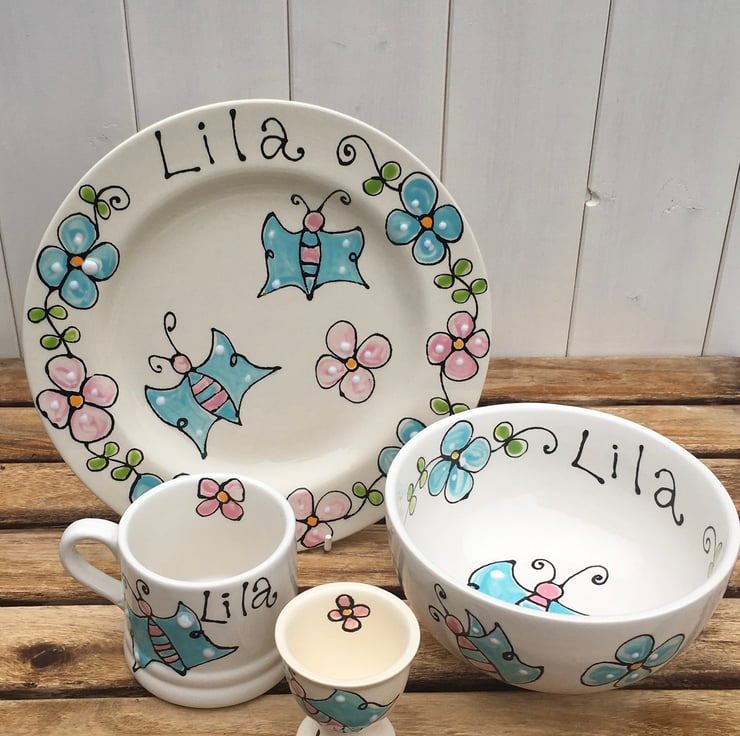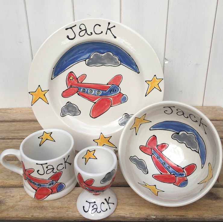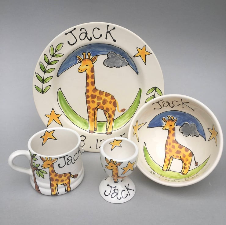 Make mealtimes magical with this charming handmade ceramic children’s dinner set — lovingly hand-painted and personalised with your child’s name. Each set includes a plate, bowl, mug, and egg cup, featuring one of my cheerful designs: giraffes, aeroplanes, trains, fairies or butterflies.