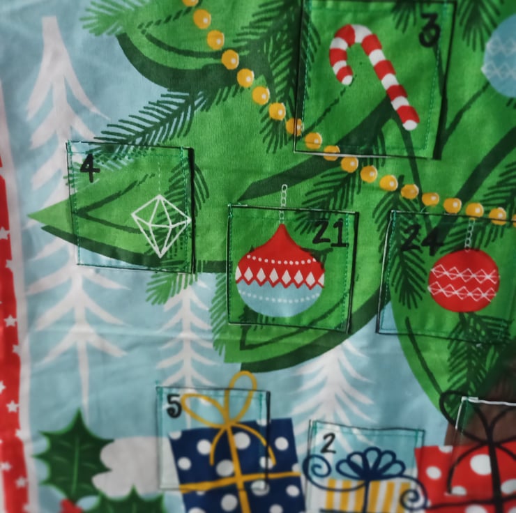 This advent calandar depicts a beautifully decorated Christmas tree surrounded by presents and with a pair of robins helpinf with the decorations. This calendar is padded and lined and has two ribbon loops for hanging. All you need to do is decide what you would like to fill each of the 24 pockets with to make your calendar complete! These calendars can be reused year after year without the need for plastic trays that are found in shop bought ones. Make one of these lovely calendars part of your Christmas traditions.