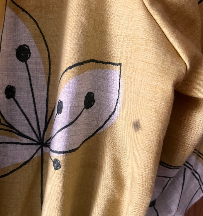 Unique, size 8 short sleeved yellow boilersuit with white plant print, There is a zip front opening, elastic waist, mandarin collar, gathered sleeves, side and back pockets and a breast pocket. The pockets have contrasting fabric in black & white stripes.