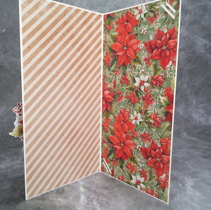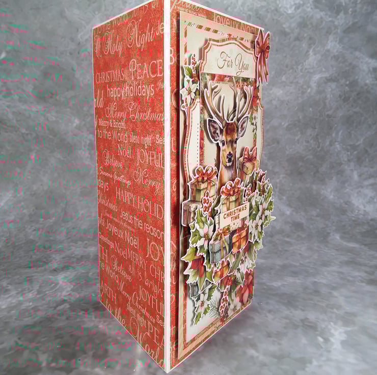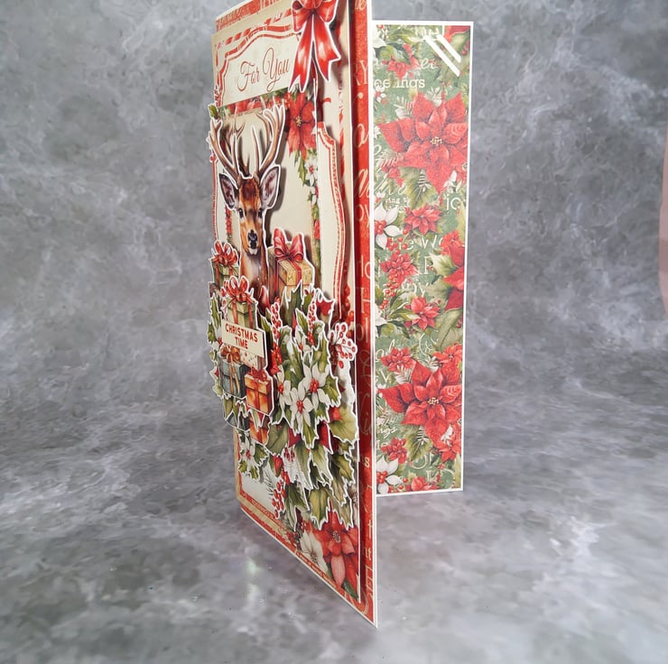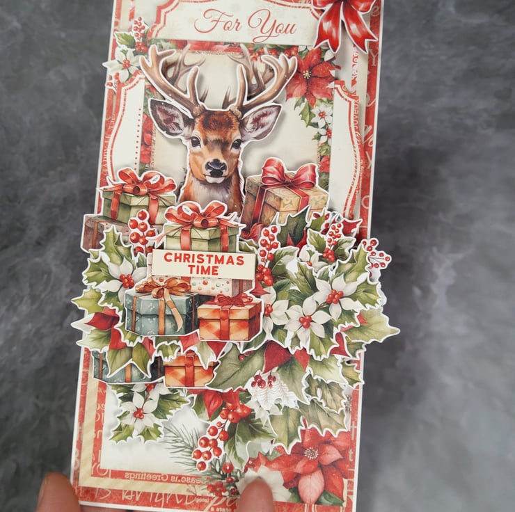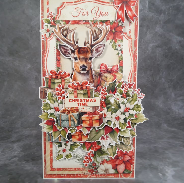 This festive Christmas card is lovingly handmade using hand-cut paper elements from a coordinated scrapbooking paper collection. The layered composition features a charming deer surrounded by Christmas gifts, poinsettias, holly leaves, and berries, creating a rich, dimensional holiday design.