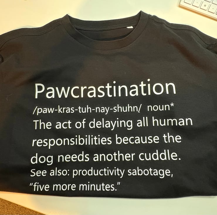 The Pawcrastination tee celebrates those wonderfully unproductive, joy-filled minutes we all lose to our furry companions — and honestly, we wouldn’t have it any other way.