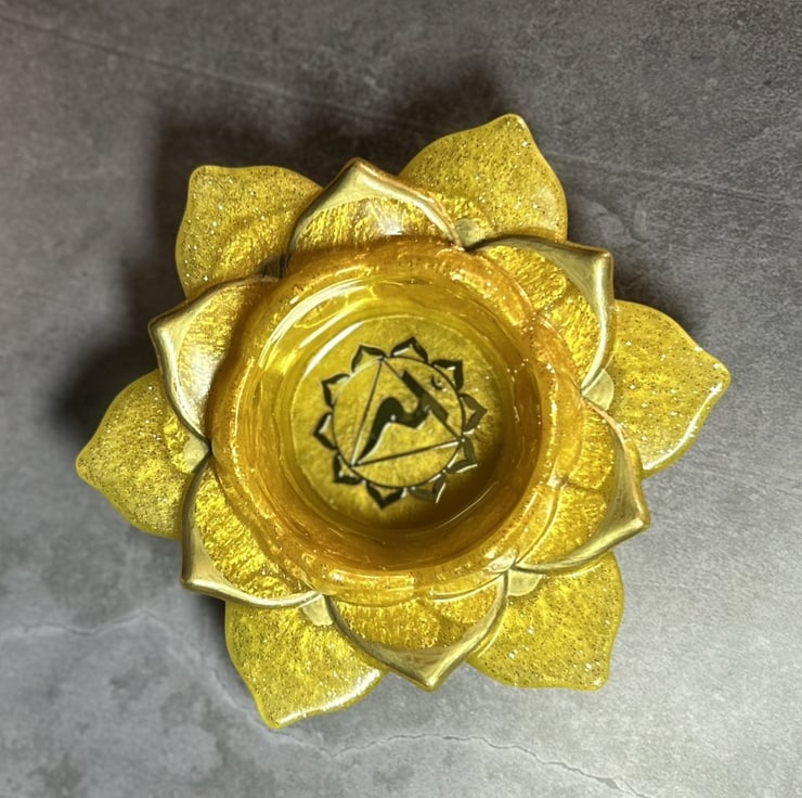 Awaken your inner strength with this handmade Solar Plexus Chakra lotus candle holder, cast in vibrant yellow resin with golden shimmer. At its heart rests the Manipura symbol, radiating energy for confidence, personal power and transformation.