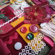 Available in 2 sizes. The photos show the A5 starter box, and includes over 30 items of carefully curated vintage, reclaimed or salvaged textiles and haberdashery. The A4 box has over 40 items, including extra curtain fabrics in larger sizes, more variety of trims and a bigger foundation piece.