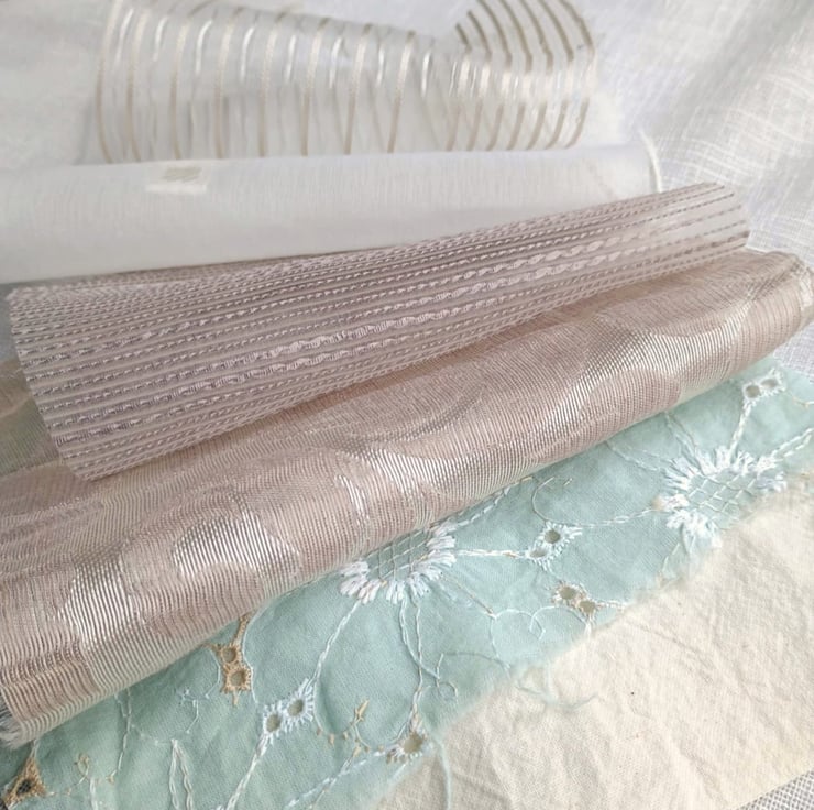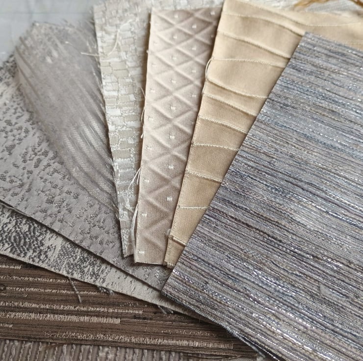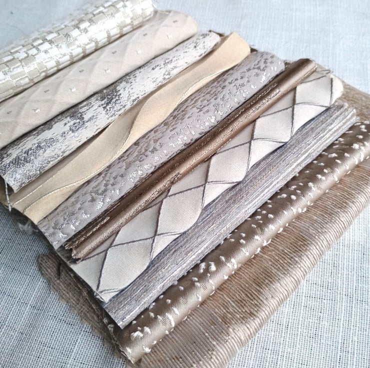 - Textured curtain fabrics including shiny and matt satin, metallic