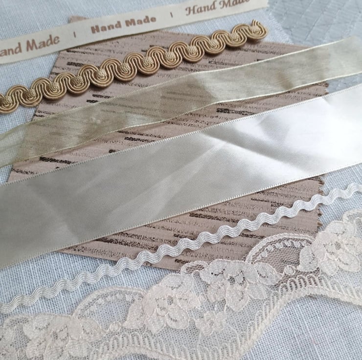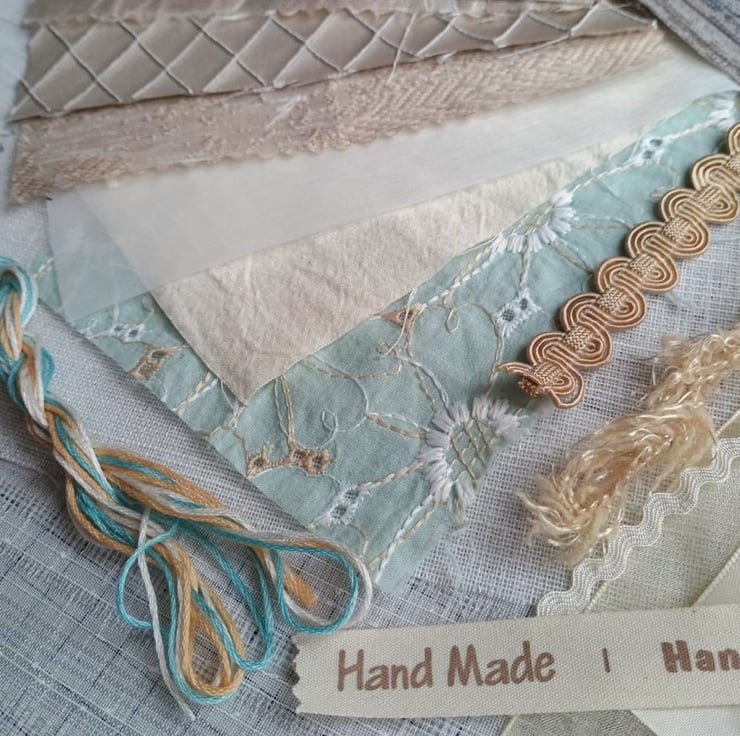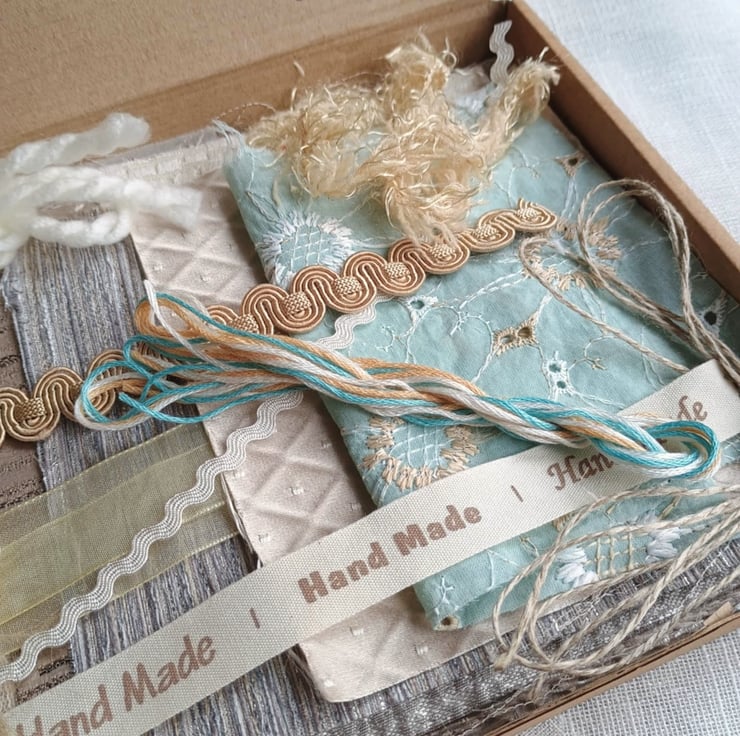 Available in 2 sizes. The photos show the A5 starter box, and includes over 30 items of carefully curated vintage, reclaimed or salvaged textiles and haberdashery. The A4 box has over 40 items, including extra curtain fabrics in larger sizes, more variety of trims and a bigger foundation piece.