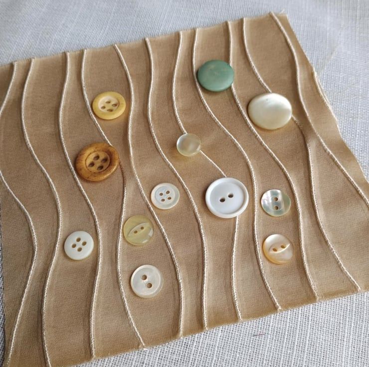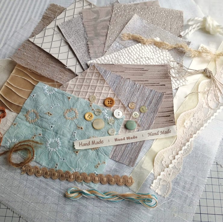 Looking for way to relax? Try slow stitching with my muted metallic textile kit in gold, bronze and copper, with cream and duck-egg blue. Built around a collection of reclaimed curtain samples, with co-ordinating, ribbons, yarns, threads and buttons.